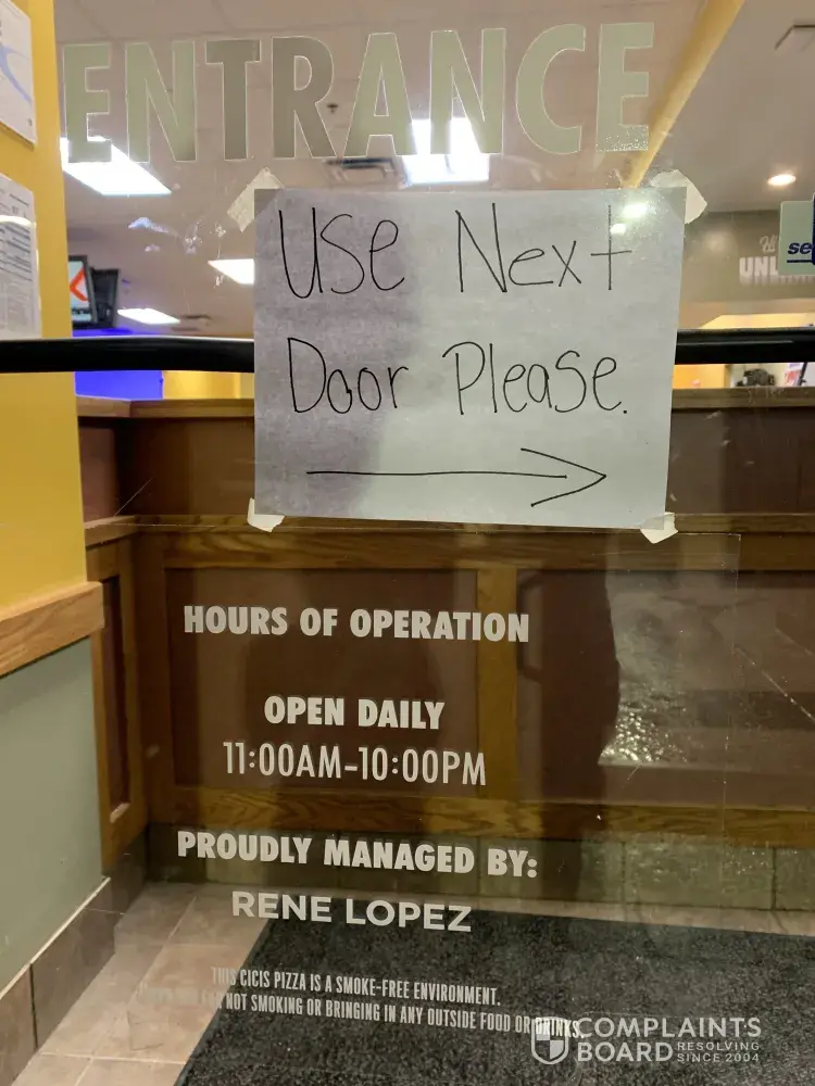 Manager Rene Lopez of Cumming GA Location denies to let me eat at Cicis at 9:10pm 2ndMar-20 and gave me only option to take away. I saw other people were seated and eating. I asked why we are not allowed? She said we need to clean. I said its 50 min. to go and above that there is no mention on door about that. She also denied online hours on google are not valid that says till 11pm. She also said you have to come in store to know we don't allow sit and eat after 9pm. Though the door says open till 10pm. She was rude and not sorry for anything. Very bad experience . It felt i am paying and not getting service. I am huge fan of Cici's but now i will think twice before going there. Specially Cumming location but also other locations. Very disappointing behavior. Eating food at a place that makes me feel discriminated and unwelcomed. It is not good appetite if vibes are not correct. Not acceptable.