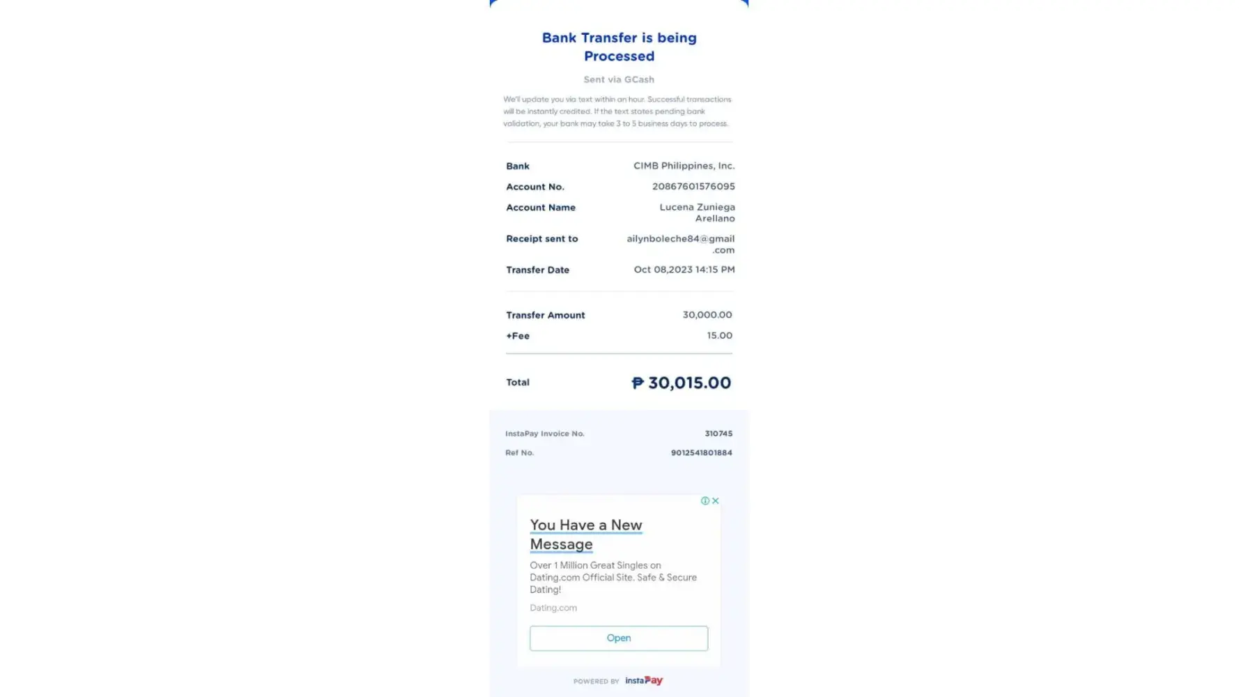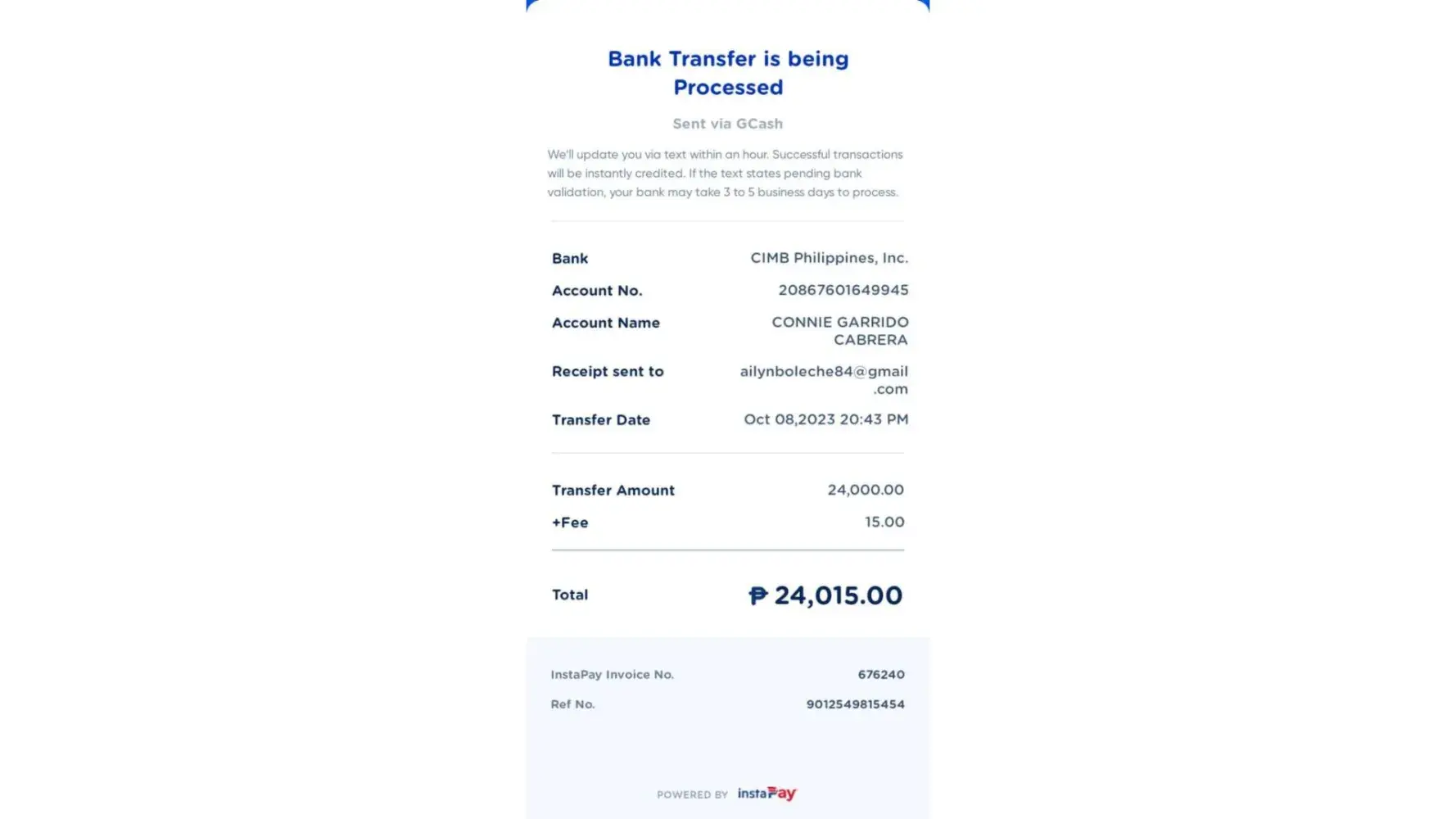 I send money to CIMB bank account name Lucena Zuniega Arellano with account # [protected] worth 15,000 on Oct. 08, 2023 13:34pm and 30,000 on same date at 14:15 pm for payment of purchased product on tasking job of Lazada Platform and another 24,000 to CIMB bank account name: Connie Garrido Cabrera with account # [protected] on oct. 8, 2023 20:43pm.