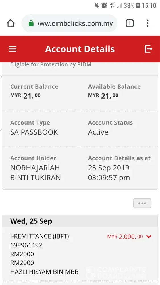 Cimb-[protected] transfer Rm50 ke maybank, amount telah dikerdit pada akaun CiMb, tetapi pihak may bank tak dapat sebarang amount of transfer -pada 25/09/19 jam 9.53am .