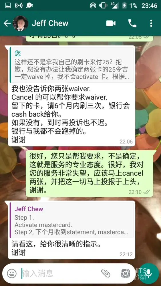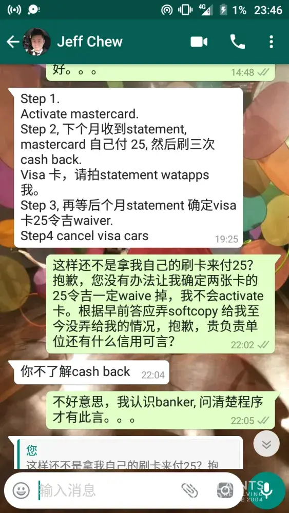 Jeff did not immediately attend to my cancellation request, but asked me to activate the VISA card, pay RM25 first and swipe 3 times before cashback instead.