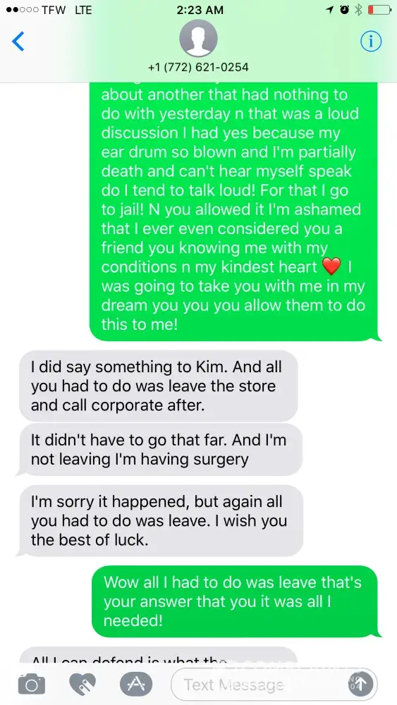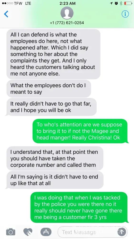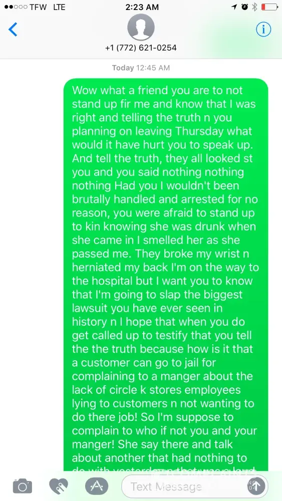 I'm a handicap 46 yr woman that was Brutalized by police on the 12 of September. Falsely arrested over a cup of coffe at circle k. Which the attending supervisor was the one that insited the quarrel walking into a conversation misunderstanding what I said n I wasn't even the one complaining. Police brutality in Port Saint Lucie has to stop. N the sad part was that I had 8 spasm attacks between getting arrested n at the county jail and did nothing to aid me! I'm suing circle k, the police department and the county jail! All which is on video! From the store to the dash cam to the county jail. The treatment was worse there by white officers n the nursing staff in initial intake! This is all so sad I feel voilated n disrespected felt like I was treated like an animal. They had no charges so they trumped up charges! I have never been in trouble with the law I'm a military spouse my husband currently serving this great nation for 20yrs had to help me from across the world to bond me out so I can immediately go to the hospital for emergency care! I am disabled I have degeneration of the spine 7 herniated disks, osteoarthritis in my hands knees and lower lumber abd wrist. I couldn't resist arrest even if I wanted! My body wouldn't allow me, n they thought I was resisting them n I kept screaming on the top of my lungs I'm disable please stop your hurting, but that only made them slam me harder into thier vehicle n dig his whole forearm into my face n neck, blood shotting my eyes from the pressure applied they kept saying I was screaming at them yes your violating all of my constitutional rights n I'm partial def I can not hear myself speak so I tend to talk louder because I can't hear myself speaking! It was all so unprofessional n disheartening because aren't police suppose to defuse a situation not escalate it? Aren't they suppose to hear both sides? Never mind that I've been going to this circle k fir 3 yrs almost 4 everyone there knows me by name. Jackie they call it's my nickname n I have never been IRRATE or disrespectful to any of them at anytime instead very helpful, if you look back in their video history you will see I come in every day to that store n always leave them laughing with a smile a very loyal customer, n just like that the supervisor Kim whom by the way every morning reeks of liquor came in an assumed I was the one complaining when it was other customers in the store n I was coming to their defense saying they new n working on getting better, n the manger Christina was behind the register, suddenly became quiet n Kim accused me of bad mouthing her employees n literally told me to get the [censored] out the store Christina stood there n allowed all of this to go down knowing the truth she was afraid of speaking up and losing her job! I have texts which she dared to send me, as if I'm suppose to understand that there was nothing she could do! Had she told the truth none of this would have happened I have photos videos n medical reports of the contusion to my right wrist n spine! All because another customer said the coffe had been bad in the last few days! I go to jail! N even if I did voice my opinion am not suppose to speak to a manger and supervisor n bring that to their attention? If not them, then who? And again I wasn't even complaining which makes all this so sad I was actually defending them n Kim walked into a conversation under assumption without facts n called the cops on me over that! This same store has targeted many people almost every week out this same store police Harassed customers just sitting in front of store in their vehicles. Police are suppose to protect n serve us tax paying citizen n not guarding n protecting just business in the community they suppose to give someone an opportunity to speak n say what they need to say as much as the complaining party both sides of the story, not just accuse me assume me guilty n now I must prove my innocence none of this warrant it an arrest which lead to an illegal search n seizure of my property in which they found 0.04 gram of marijuana which I have a medical marijuana card and I'm disabled, here a the trump charges resisting arrest with no violence!