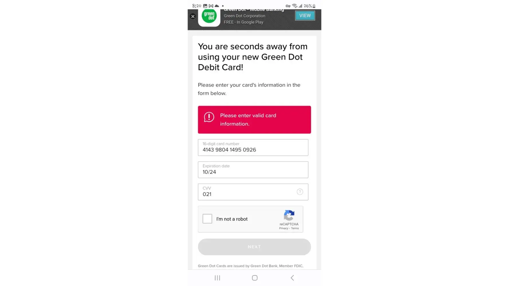 Faulty $100 visa gift card