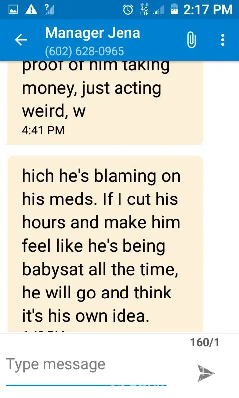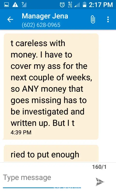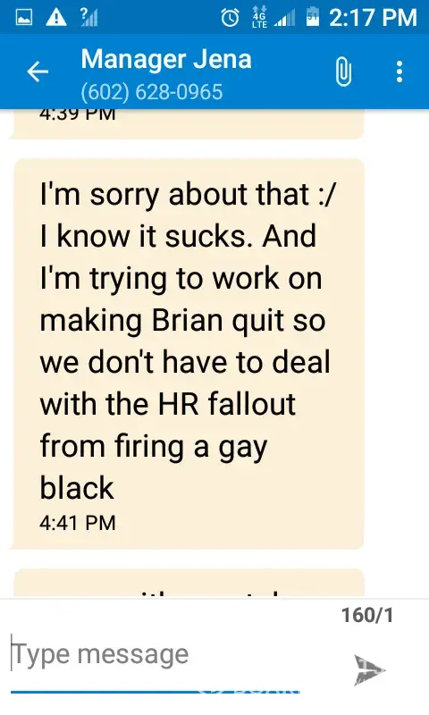 I have texted from the manager to me regarding makin a coworker quit... Because she's White he's black. So unethical circle politics and treatment of employees is outlandish