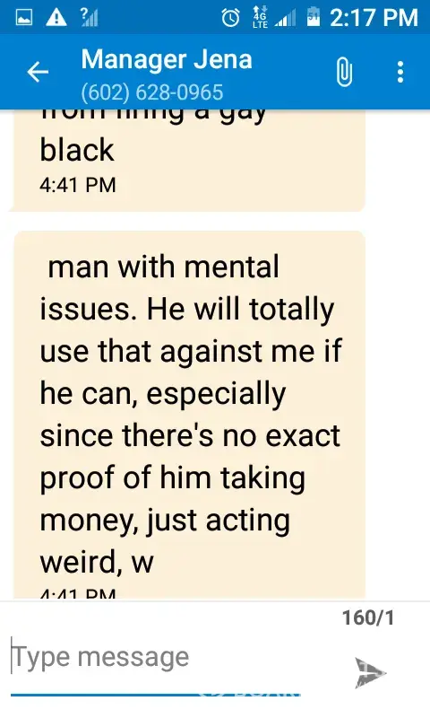 I am a former employee at circle k. The complaint is about the manager Jennifer brown at store 03745 in Scottsdale AZ . Who through text as I show below her disclosing personal information about another employee who just so happens to be black, gay and bipolar... Not only does she lie to me she tells me she's going to make him quit his job. She didn't need human resources all up in it as well as. She can't fire him because there will be drama because she's White married women and he's black gay and bipolar... This is is not ok ... This poor young man was being treated like [censor] worked to the Bone cut hours trying to make him quit. He has since obtained a lawyer .. but circle k is one of the lowest forms of garbage there is .. not only does the market manager earlinna van fossen attempt to bully employees play head games over work them discriminate . They both write off items in the store like they are defective or. Expired so they don't have to pay for them.