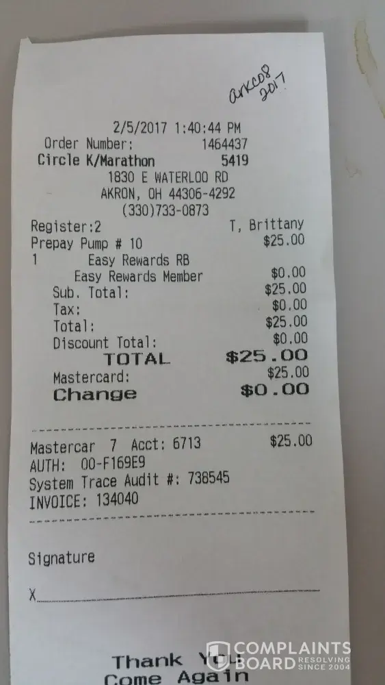 After filling my tank I went back inside to get my change and they told me it would only charge what I used, however...my receipt says $25.00 and my bank accepted a charge for $25.00 but my problem is that I only used $21.60. I had taken a picture of the gas meter because something just didn't seem right, but they (the attendants) were both adamant that I would only be charged the amount I used. Please confirm that on 2/5/2017 the store on 1830 E Waterloo Rd is off on their gas to $ reconciliation and please refund $3.40 to me or compensate me for the said amount. I can email you my receipt and the photo if you'd like. My email is [protected]@yahoo.com, my phone is [protected] and my name is Charlotte Arkwright. Please advise.
