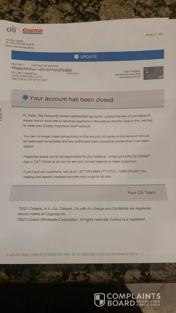 My citibank costco credit card was cancelled without intimation for no reason, despite a very prompt repayment record and no complaints. Upon calling customer service, I was asked to expect a latter that I finally got this week. Called customer service listed on the credit card and they asked me to check with the credit bureau, which has no adverse comment.
