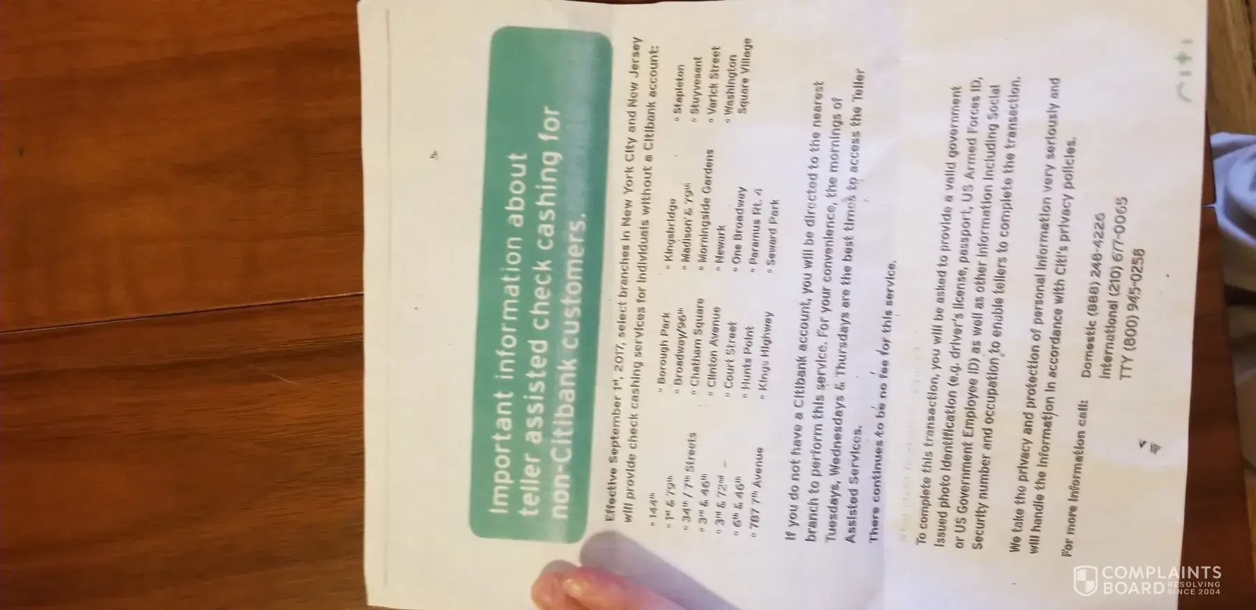 Today Friday August 3rd 2018 about 2PM I was given a list of branches that cash CITI checks. I have no checking but do have credit cards. I have been through the verification process which was smooth and effortless at 96th & Broadway NY NY where I simply present ID, am asked my social and what my current occupation is.