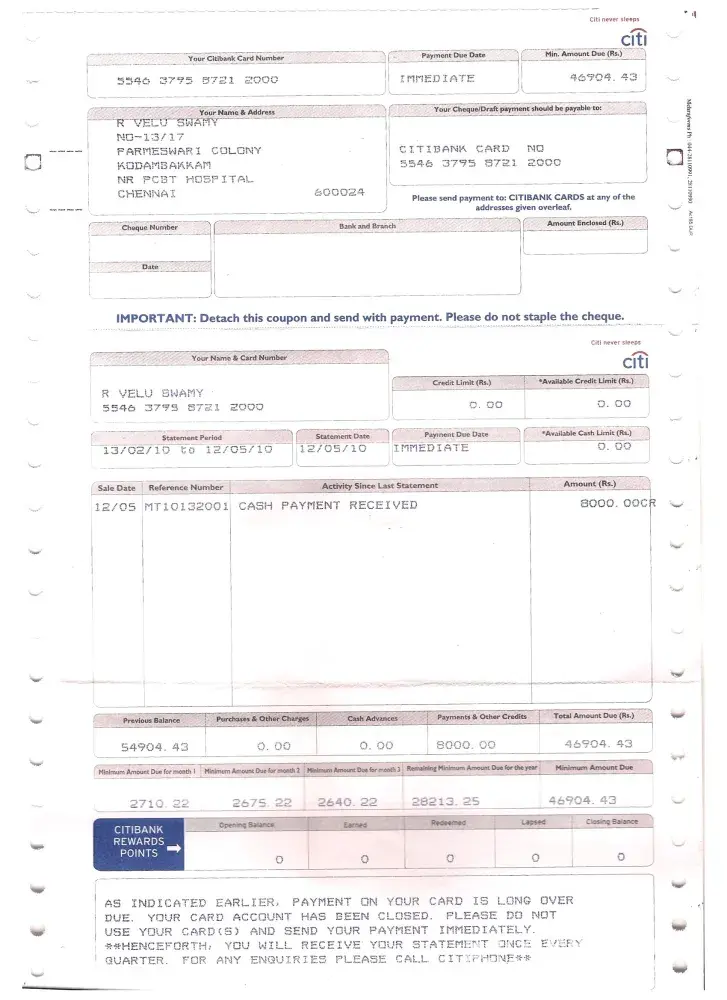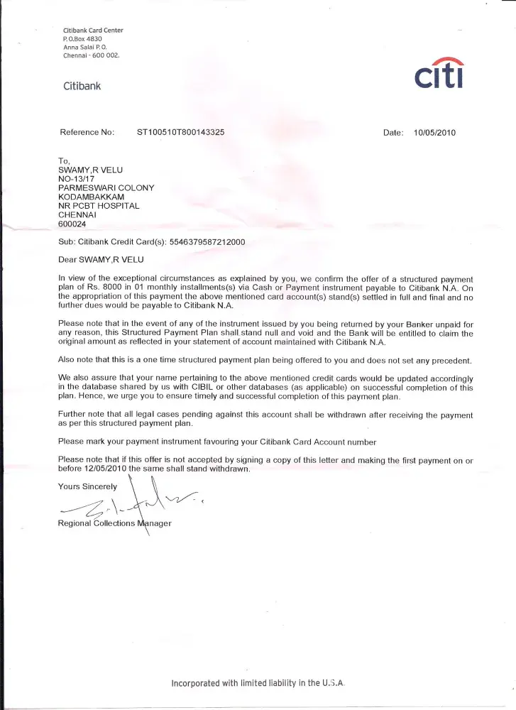 I have Using your CITI bank Credit Card since 2007. (CITI Bank Credit Card No. [protected], in the Name Of R.Veluswamy). But i Couldn't make the payment for the last 2years i have explained my suituation to their executives and manager's, they planed and offering me to settlement of for Rs. 8000/- on 10/05/2010.(here i have attached the settelement Letter copy, pls find the soft copy), i made the payment on 11/05/2010. (here i have attached the bill payment copy, pls find the soft copy). and now i have received the a statement like received cash payment of Rs. 8000/- on 12/05/2010. and still showing payment over due pending...