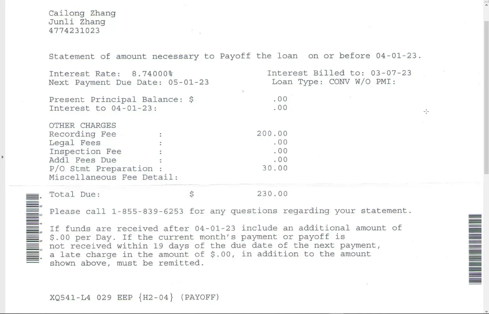 As a response to my letter, Cenlar immediately sent me the closing cost statement for several hundred dollars plus statement processing fees. In a phone call on 4/19/2023 with Cenlar (Phone #[protected]), I was told that I had no signed documents with Cenlar, and my account was actually transferred from Citibank.