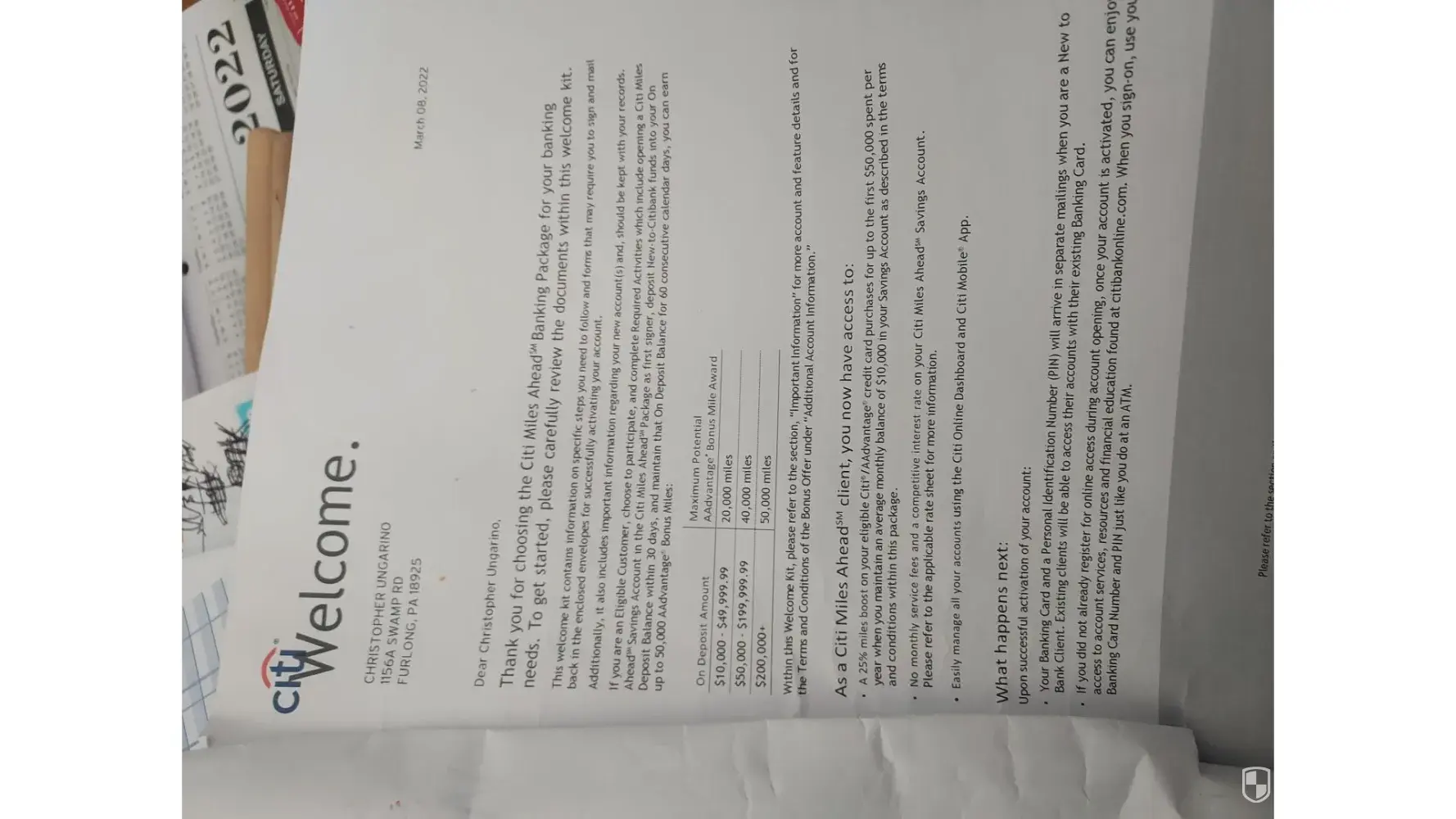 I was sent documentation from Citi as a promotion for depositing 60,000 dollars for a 40k miles to be deposited into my American Citi Account .My savings account is [protected].I do not understand why this is such a problem when you sent me all the docuemntation and I signed the w9 and did this via docusign.