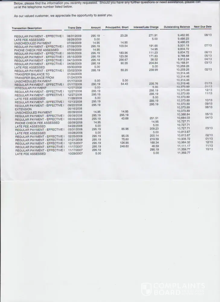 i have the same problem! please contact me i pay 470! 250goes to intrest and the rest to the principle~! its insane and all because i was late twice! but its paid and up to date now for over a year and a half! every time half goes to intrest and only like 190 is taken from the actual loan! ahhhhhhhhhhhhhhhhhhhhhhhhhhh... i have all my records! ALL OF THEM! MOFO's they better give me my money back. they have only taken out about 5000 from 21000 when ive actually GIVEN THEM like 13000!
