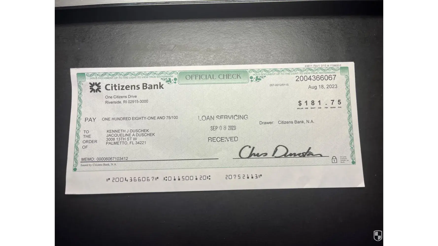 Citizens Bank Citizens check sent to me was returned by my bank