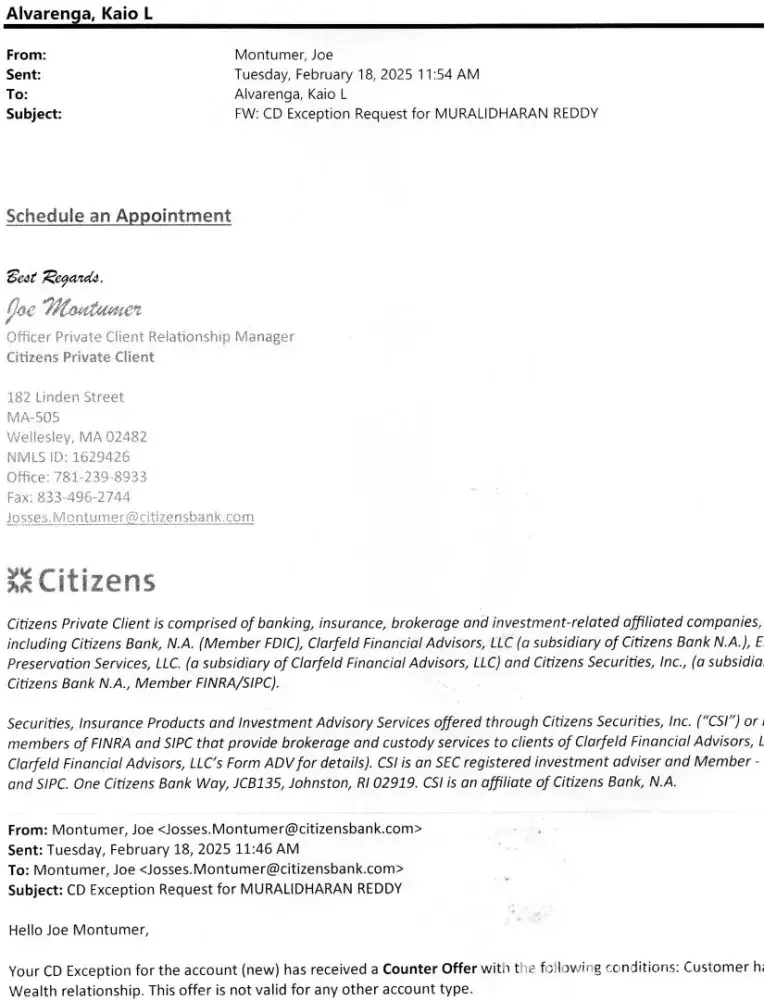 The below email was originally posted under Citizens Bank reviews and also emailed to multiple email addresses within Citizens Bank on September 27, 2023. On September 28, 2023, I received a Citizen's correspondence email from Tonya Lariviere who claims to be the Senior Advocate in the Chairman's office. We did exchange a few phone calls and emails after...