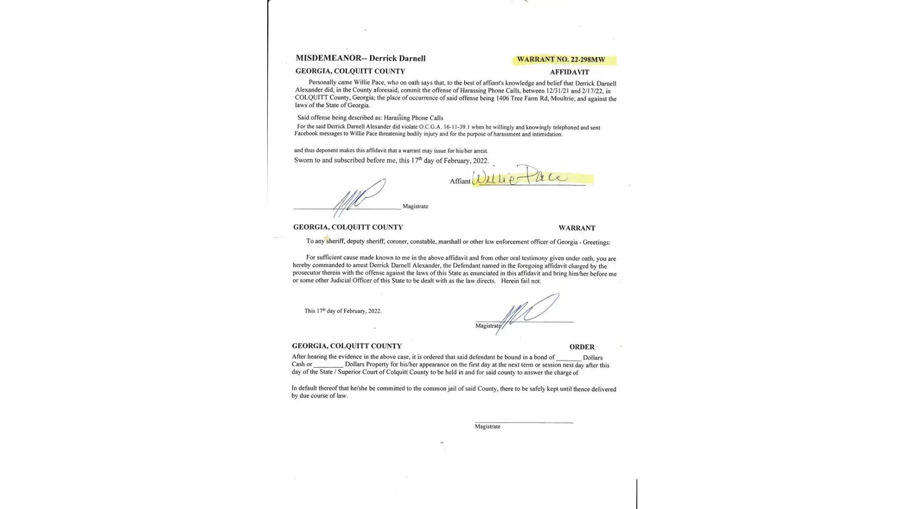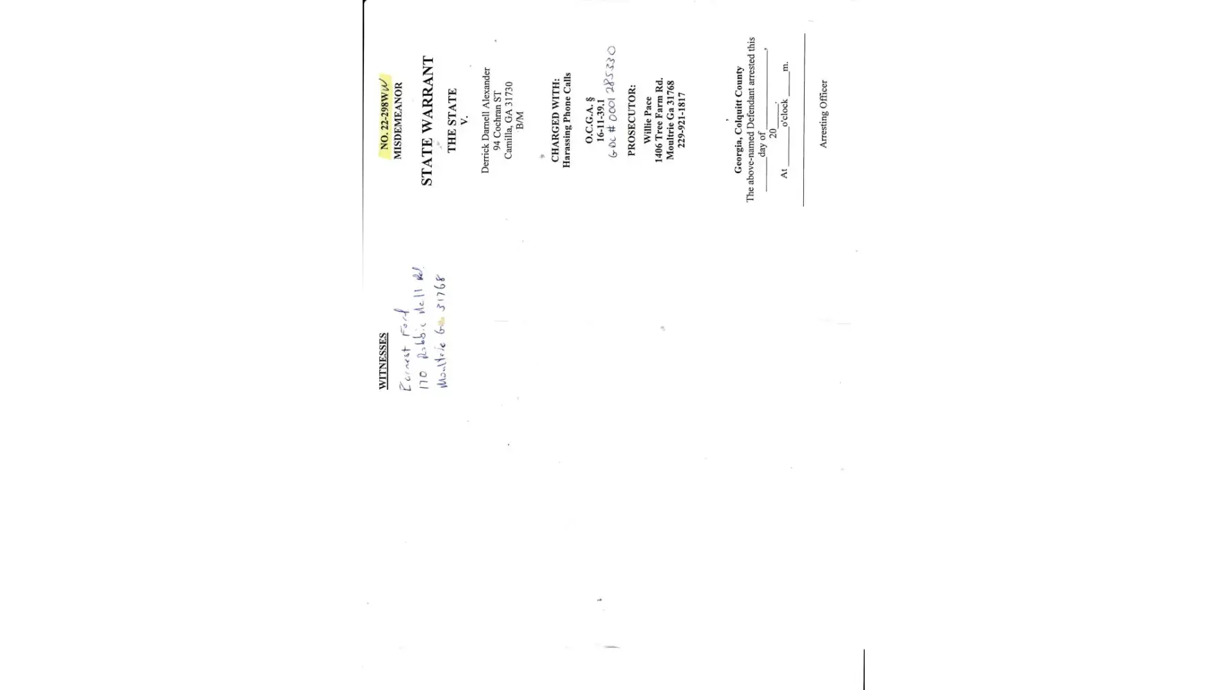 Late Friday Afternoon, I received a phone call from the Magistrate Court, asking me to come in and sign the form the arrest. When I got there, I signed the form, but I noticed there was only formed to sign. It should be two. How is it possible to issue a warrant one and not the other, when neither one showed up for the hearing? There should have been one for each brother for failure to appear. And the name on the front of the wasn't correct. So, since I had already signed the form. I did not give it back. Then a warrant issued for me for theft by taking and disorderly conduct. I am requesting these charges be dismissed, because had judge McMillian did his job, I would not have these charges.