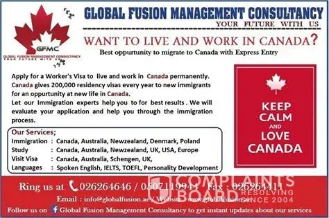Read full complaint and 5 commentsGlobal Fusion Management Consultancy - immigration workers to canada