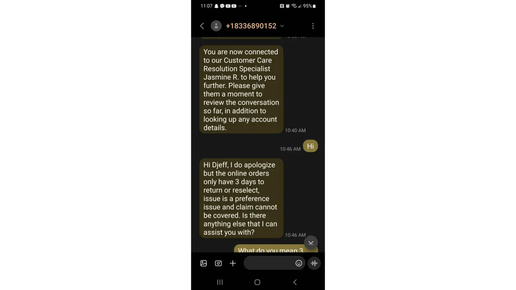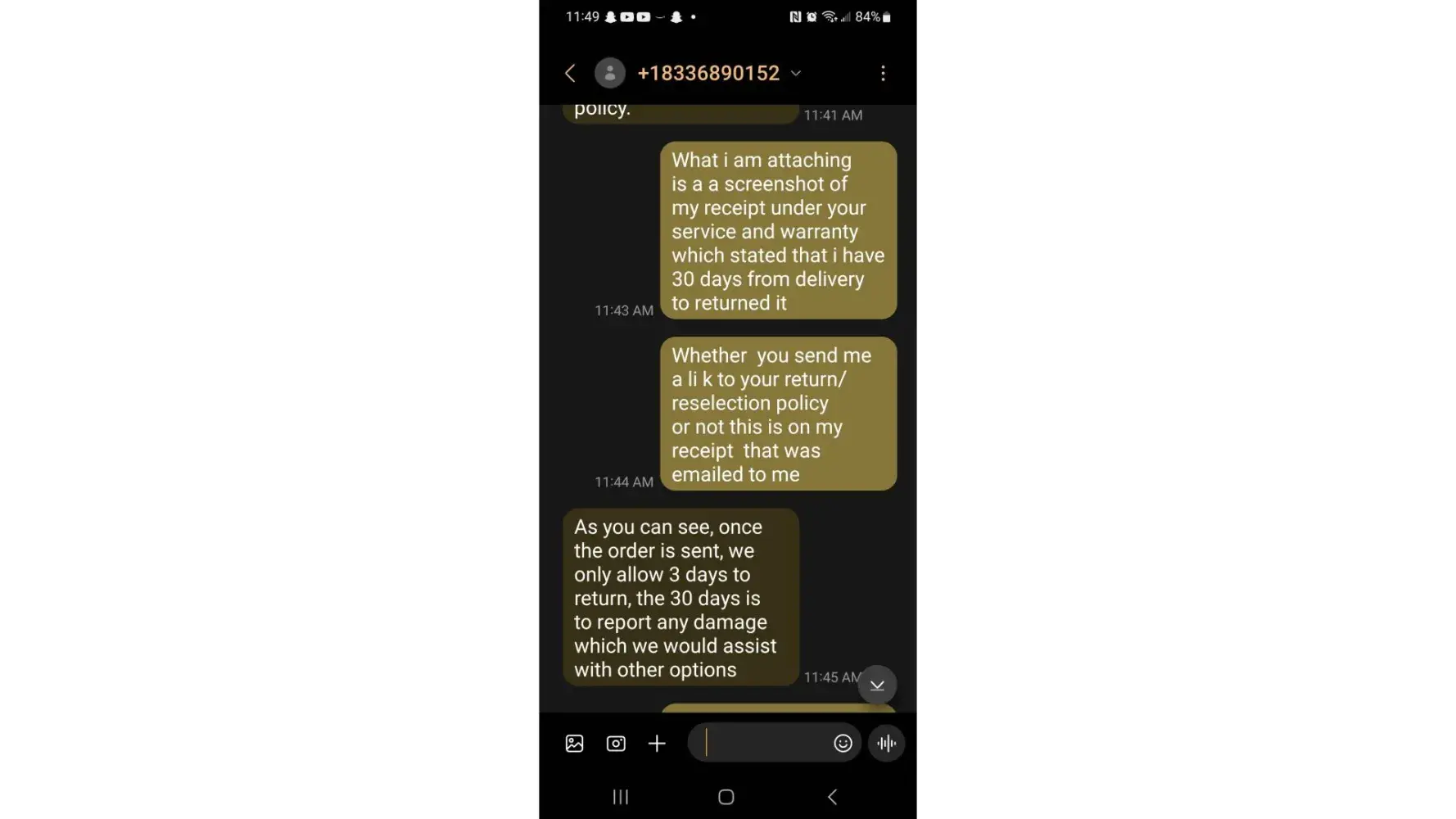 So I reached out through the text message for help and and was told by the lovely representative that their returned policy was only 3 days and when I explained to her that when I spoke with the gentleman after the setup, he said 30 days ans she responded "I do apologize about the miscommunication. Is there anything else that I can assist you with?".