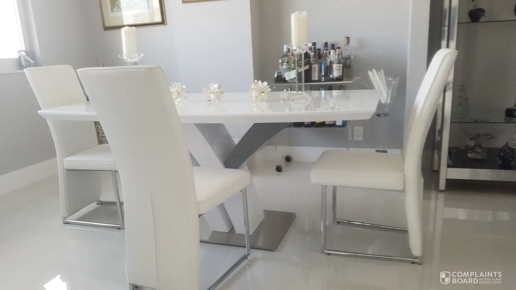 We contacted City Furniture customer care and a repair was set up. It was determined that the table and 1 chair was to be replaced. When the replacement was set up we requested that the table be replaced with the rectangular option as it would fit better and was a sturdier option. There was no price difference between the 2 tables and it was an option on the original order.