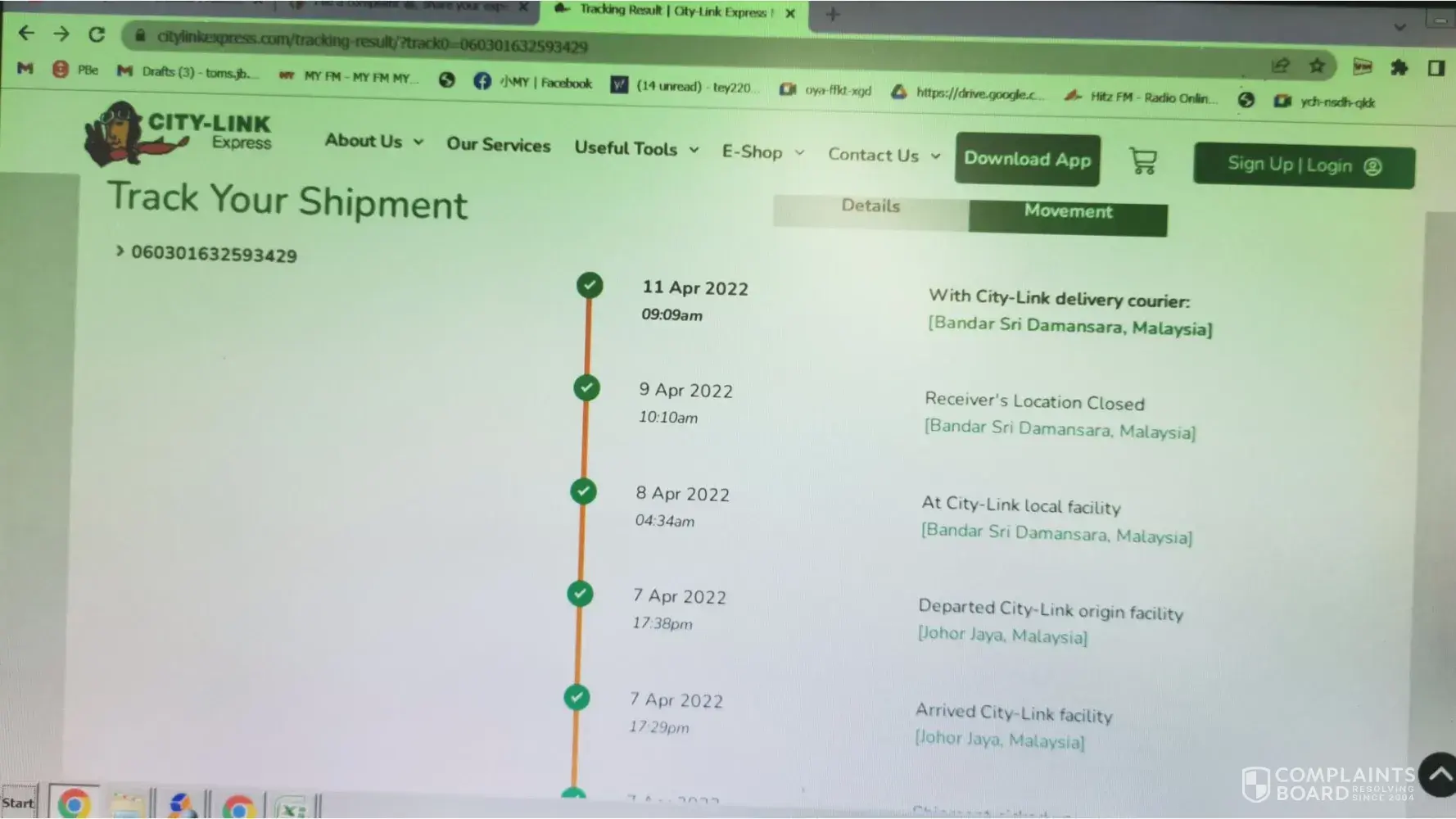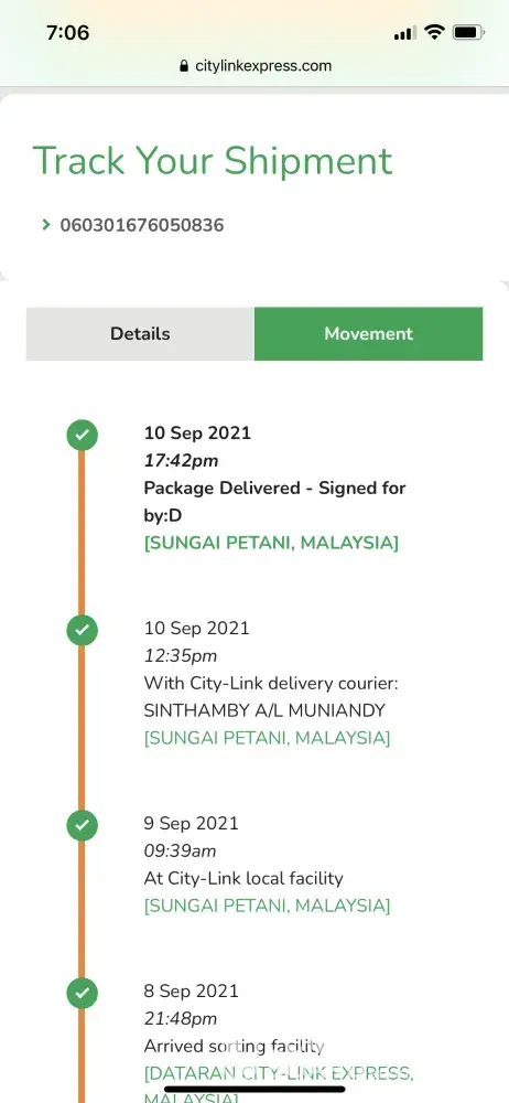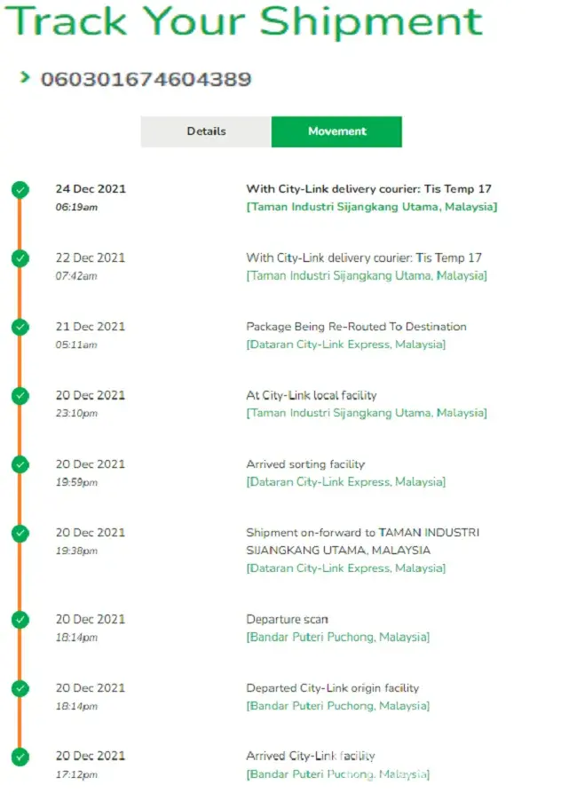 It is local Shipment ship to local area. unfortunately my client report yet received. I have email to city-link they replied will check but after more than 10days no respond from city-link even those i have follow up email with city-link everyday.