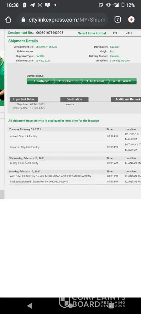 I checked by tracking number that the parcel already delivered to SMK Pelindung Jalan Kuantan - Kemaman( school)