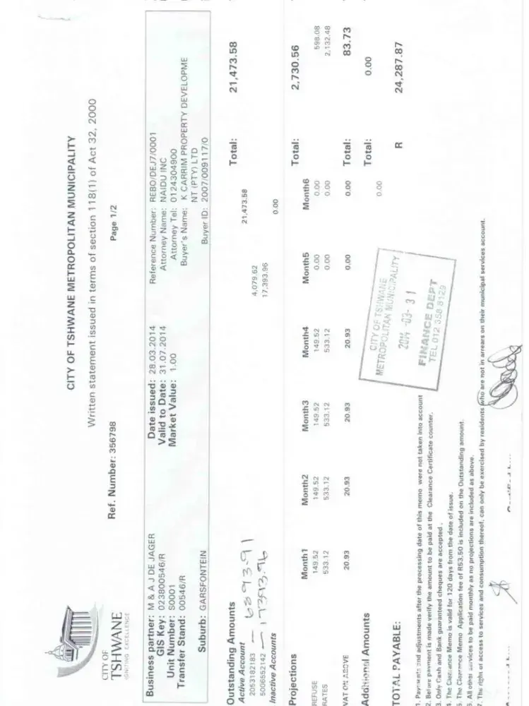 I have sent this information to various people at Tshwane, and also explained this numerous times to the company appointed to recoup the "outstanding" amount. 1. I owned the property located at 728 Nieuwhout Street (Stand 546, unit S0001) up to 2014. Please see an old account for your information attached “1-Old statement.jpgâ€, with my account number...
