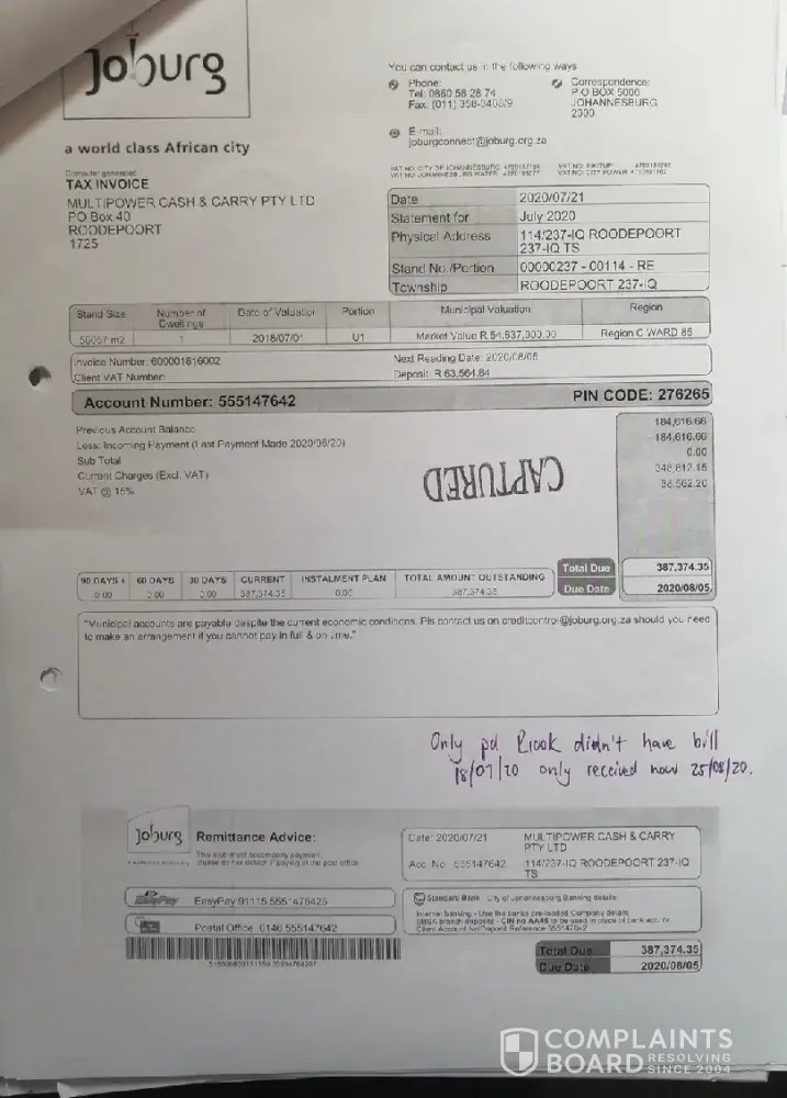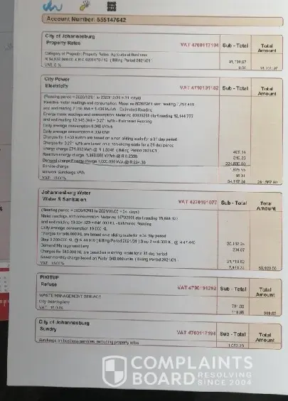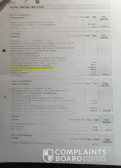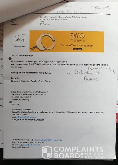We have a unoccupied warehouse that uses maybe 22.480kVArh per month, and was always billed accordingly with high demand of 170.000kVA. Since July 2020 we have been billed a high demand of 1, 000.000kVA. I logged a query on the 02/09/2020 (Ref [protected]) with the municipality and no one contacted me. So on the 15/09/2020 I sent a email to David McMahon and he forwarded my email to Jackson Mphakathi and Xolelwa Feleza. Still nothing was done. Then the City of Johannesburg had a open day which I booked the appointment to let them look at my query (ref RC116) on that day a Kholeka and Vusi helped me, they promised me they will look into it. On the 19/11/2020 I received a email that this case has been closed. But nothing has been done to this account.
