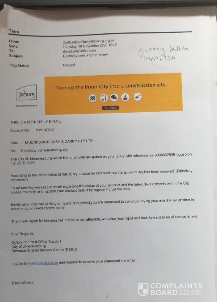 - City Power's complaint resolution process is inadequate and ineffective. The support team lacks customer service skills, training, and resources, resulting in only 0% of 2 complaints being resolved.