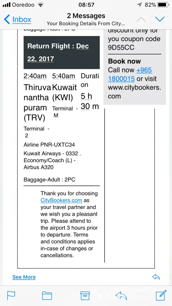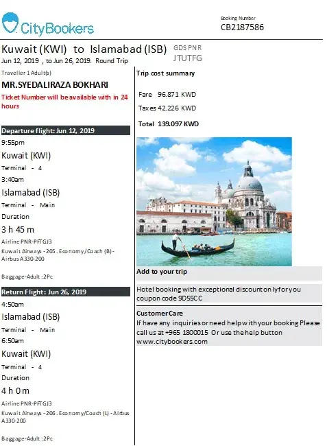 I had booked my ticket on April 23, 2019 through CityBookers with booking number CB2187586 form Kuwait to Islamabad.