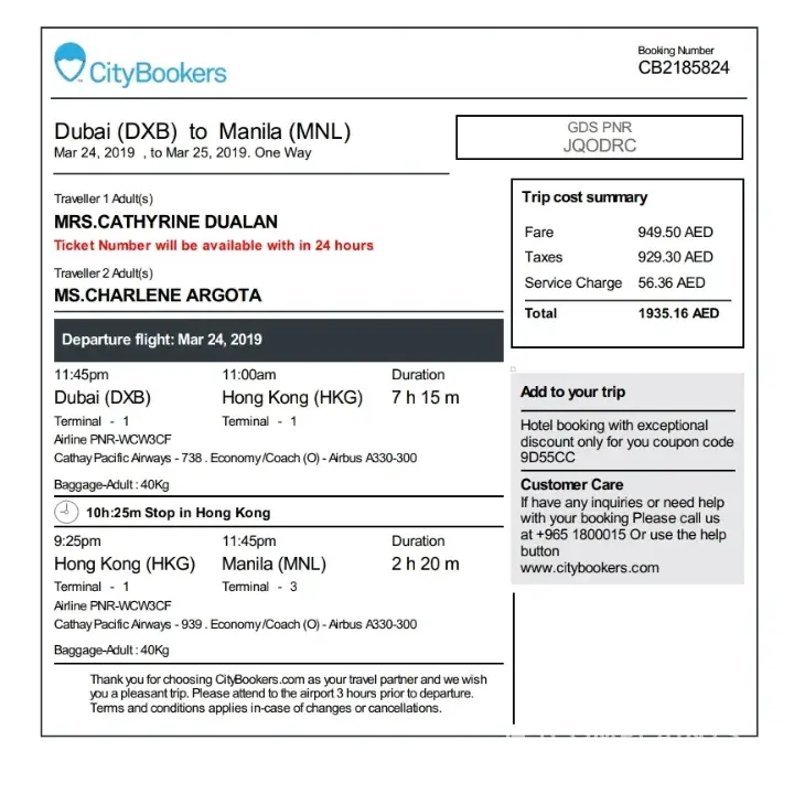 I book ticket for my wife and 2 kids last January 13. After i payed the 3 tickets it was confirmed from City Bookers that payments have been received. I waited for the E-Ticket but not come, next day i contacted the Philippine Airline office in Jeddah and upon sending them the PNR number. PAL representative confirmed the 3 tickets and send me by Email the E-Ticket with complete correct details as agreed with the City Bookers. Thanks that i fortunately received the 3 E-Tickets and print to ready for the scheduled date.