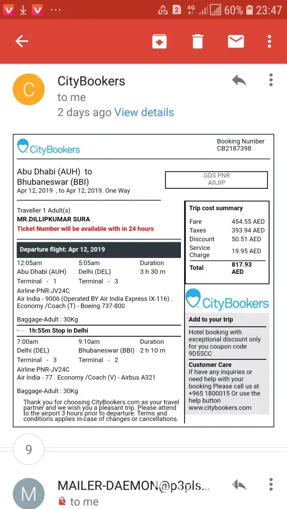 I booked a flight through CityBooker from Hyd to Dxb on 31st August.
