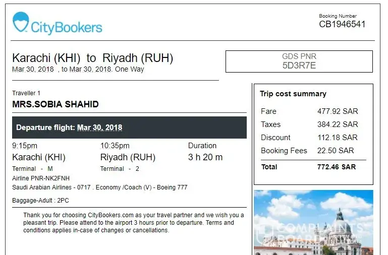 I booked a ticket on citybookers.com (CB1923214) on 21 march 2018 for my travel on 22-Mar-17, from Dubai to Chennai. I got the payment confirmation and reservation with PNR number-1B5GJO for the travel schedule.