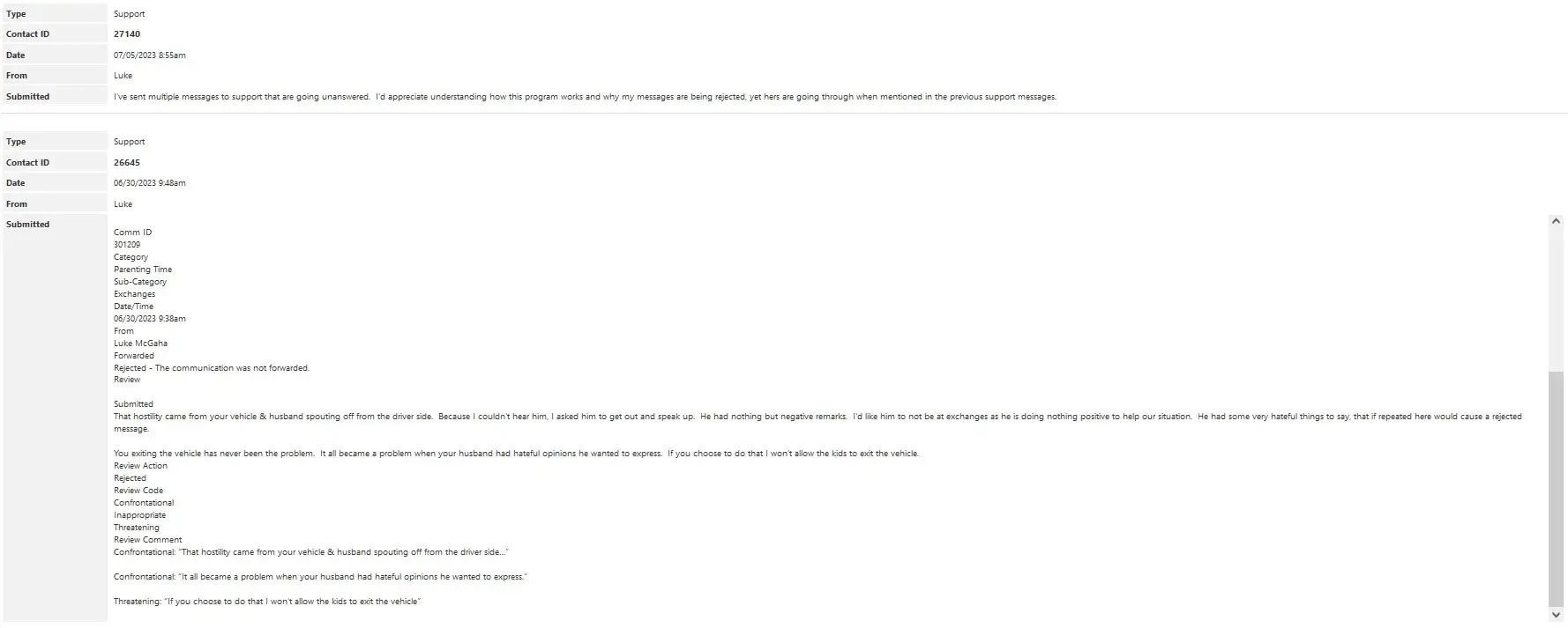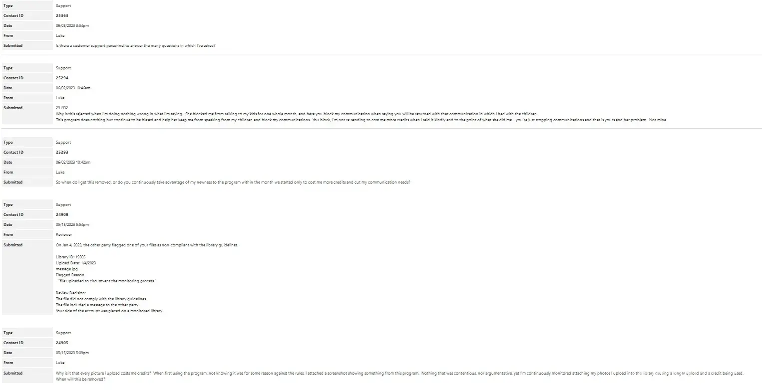 Despite my successful use of the platform, I reached a point where I asked the courts to remove the requirement of using it, and their response quickly took an unfavorable turn. They provided my co-parent with an unsupported affidavit alleging I was aggressive and conflicting, despite my review report showing zero threatening messages.