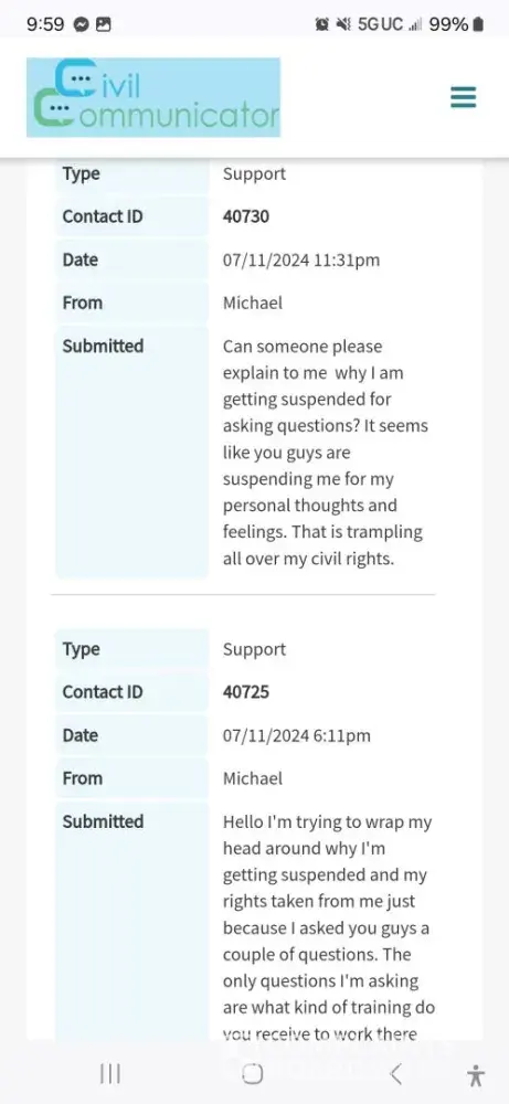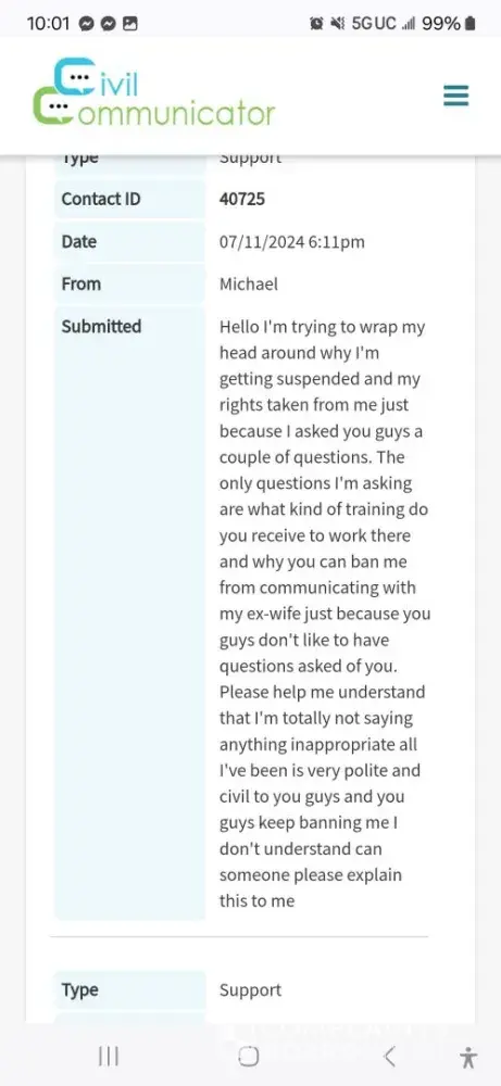 They are banning me from from communicating with my ex-wife it's the only way we can communicate because I've asked them where they get there training from and what comments of mine were inappropriate. They basically have banned me for one entire month just because I keep asking where they get their training from I've been really polite to them but yet they still banned me. I believe that trampling all over my civil rights and my constitutional rights because of this I pay them a large lump sum of money every month to be able to speak to my ex-wife and then they take that right away from me because they don't like me asking them a question. My civil rights will not be trampled on and my constitutional rights