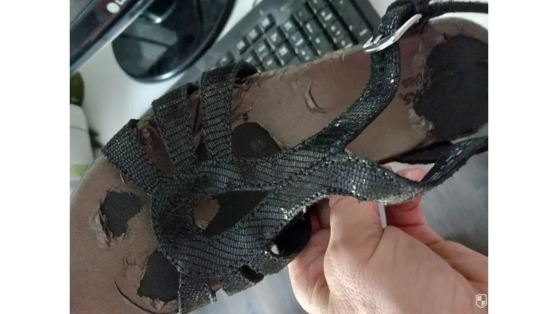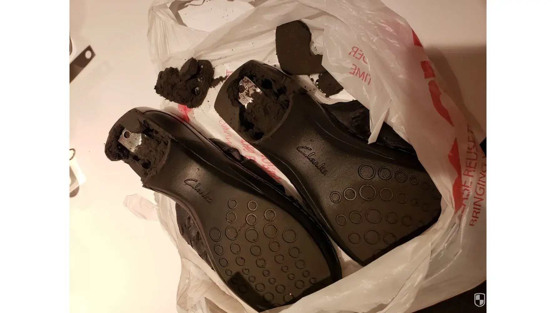 My wife and I were out having dinner with family when we noticed a bunch of black chunks of stuff on the floor under her chair at the restaurant. It turns out the soles of her shoes were disintegrating. She had to walk back to the car without her shoes because they were falling apart.