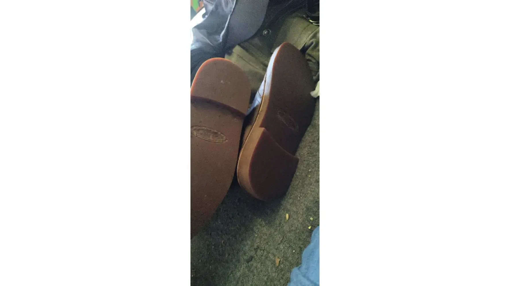 Soles of black suede sandals crumbled away.