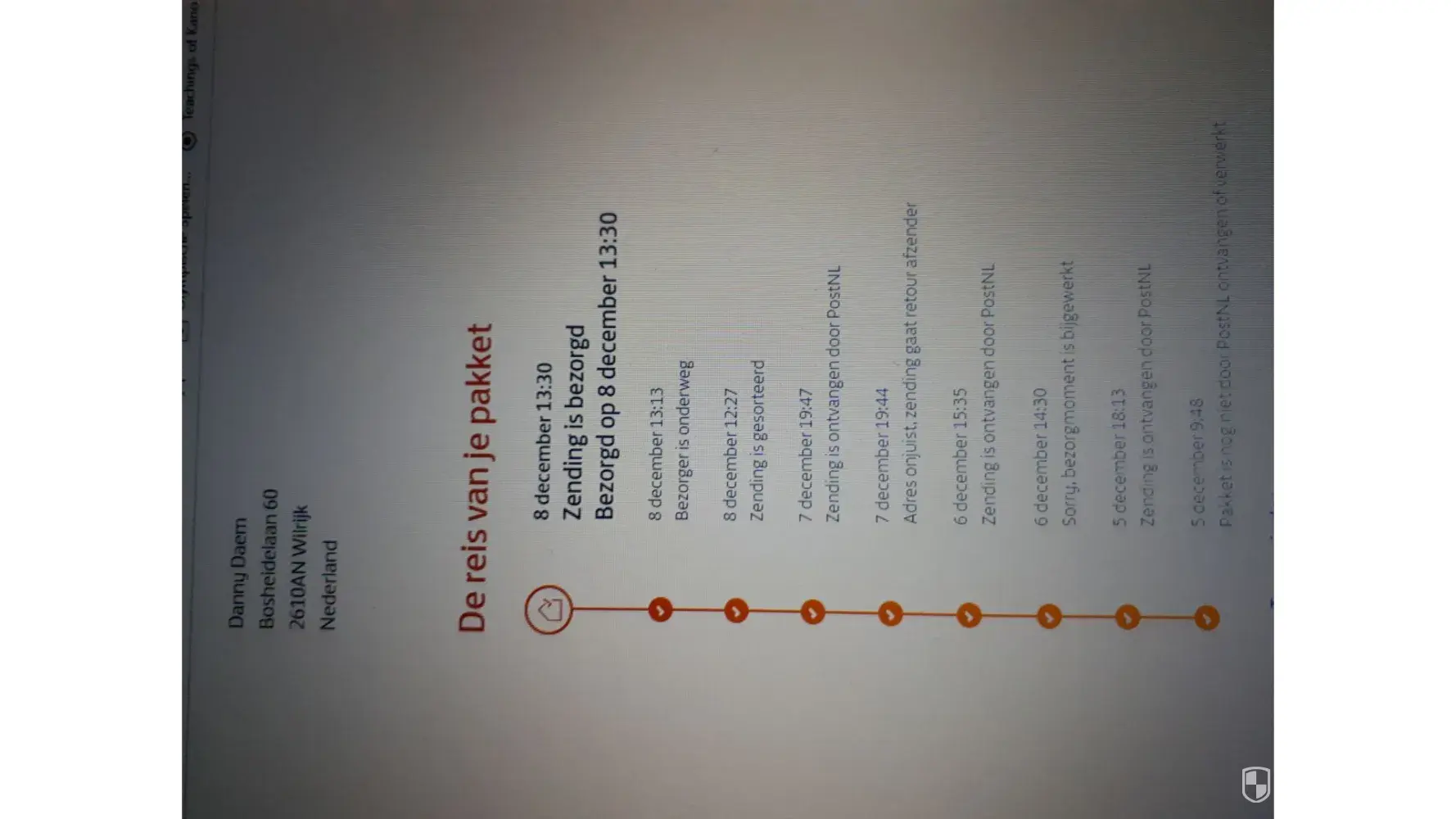 On the 8th of December at 13.30 hours I received a message from PostNL delivery service track and trace reference 3SPJFW568893710 and description [protected] with the indication that the delivery adres was wrong, and indeed it was.