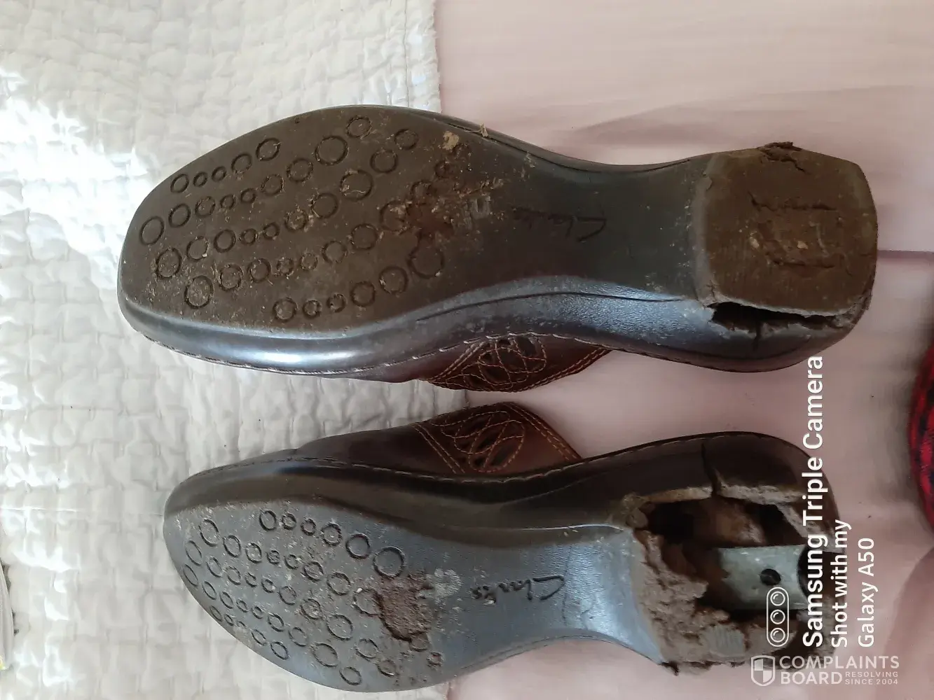 I am a handicapped 36 year old woman. I put on my Clark's Artisan shoes this morning to drive to work. I noticed my shoes did not feel right but thought it might be my weight gain. When I got out of the car I noticed a large chunk of black "dirt" by the brake which turned out to be from my shoes. When I looked down at my soles and I found out that my shoes were torn up and full of holes and large crevasses. I could have fallen very easily and shudder to think of injuries!
