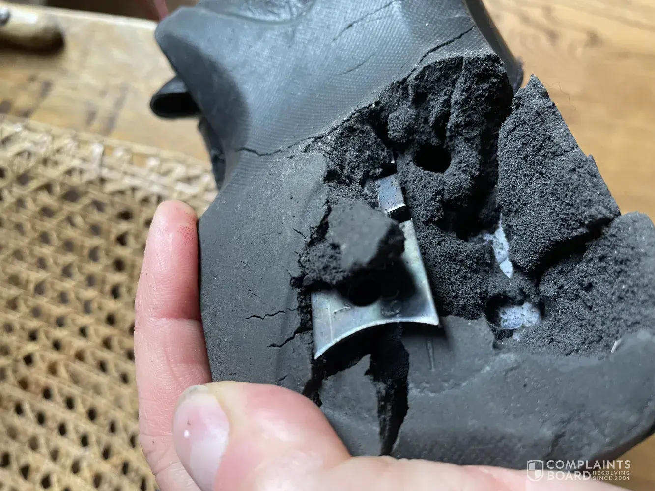 The pictures show the right shoe after the damage