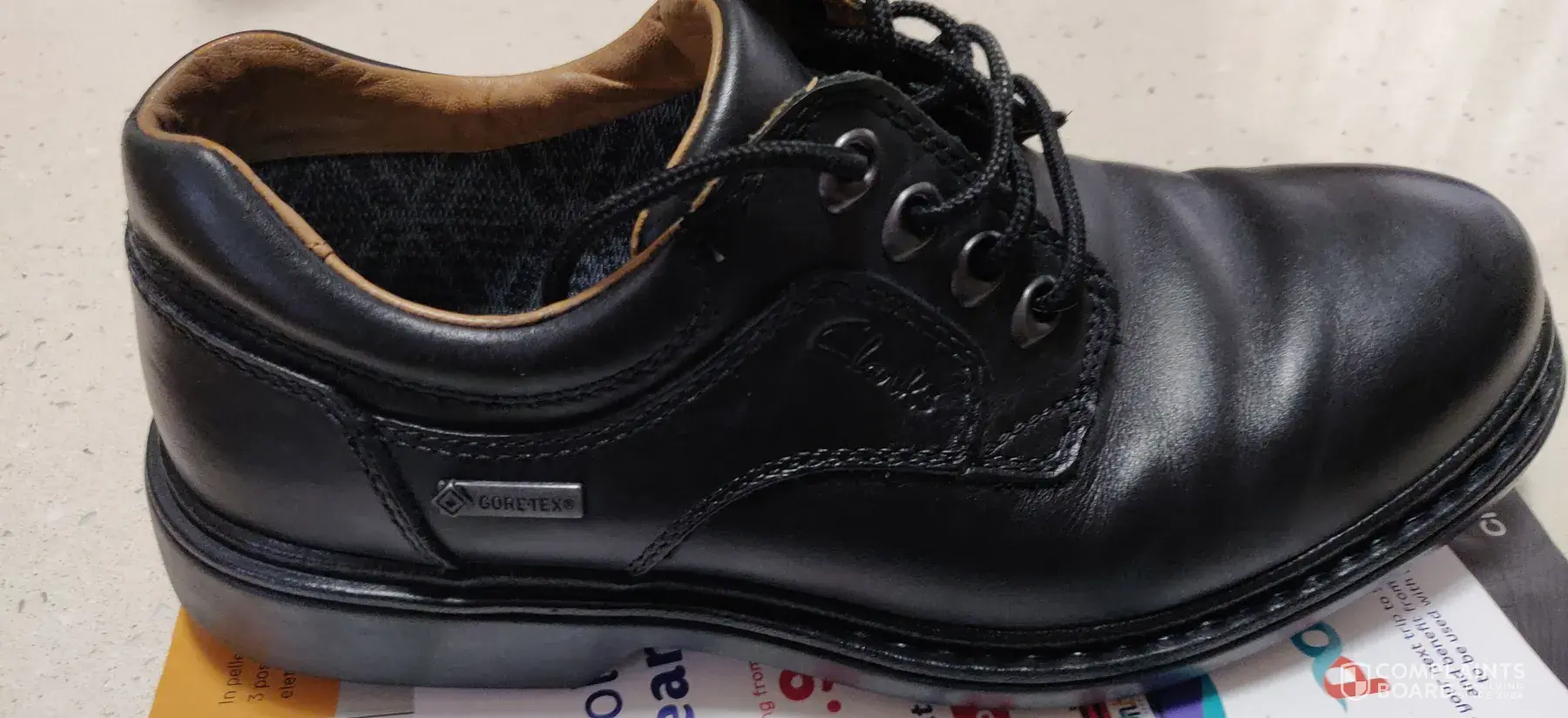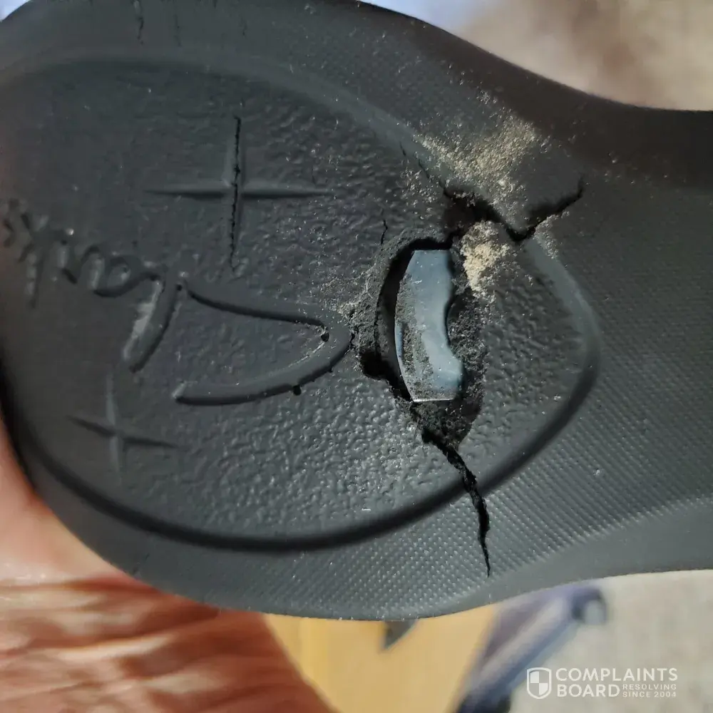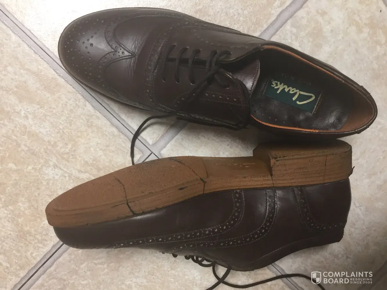 I bought a pair of Clarks shoes.They were brand new and looked perfect.I put my right foot in the right shoe.Then I turned to watch the tv for about 5 minutes. Then I went to put on the left and saw the shoe on my right foot had completely fallen apart.I couldn't believe it, bits of rubber on the floor, uppers split open, sole broken into cracked pieces and also, a lot of dust and debris was inside the shoe and it looked like there were areas of wear inside the toe section.