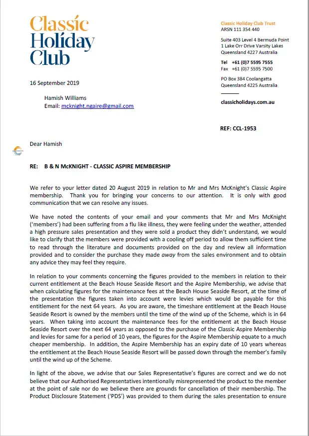 On the 2nd of July 2019 family members of mine who are long time members of Classic Holidays attended a sales presentation to your newest holiday club program after a team member approached them while staying at the Beach House Seaside resort.