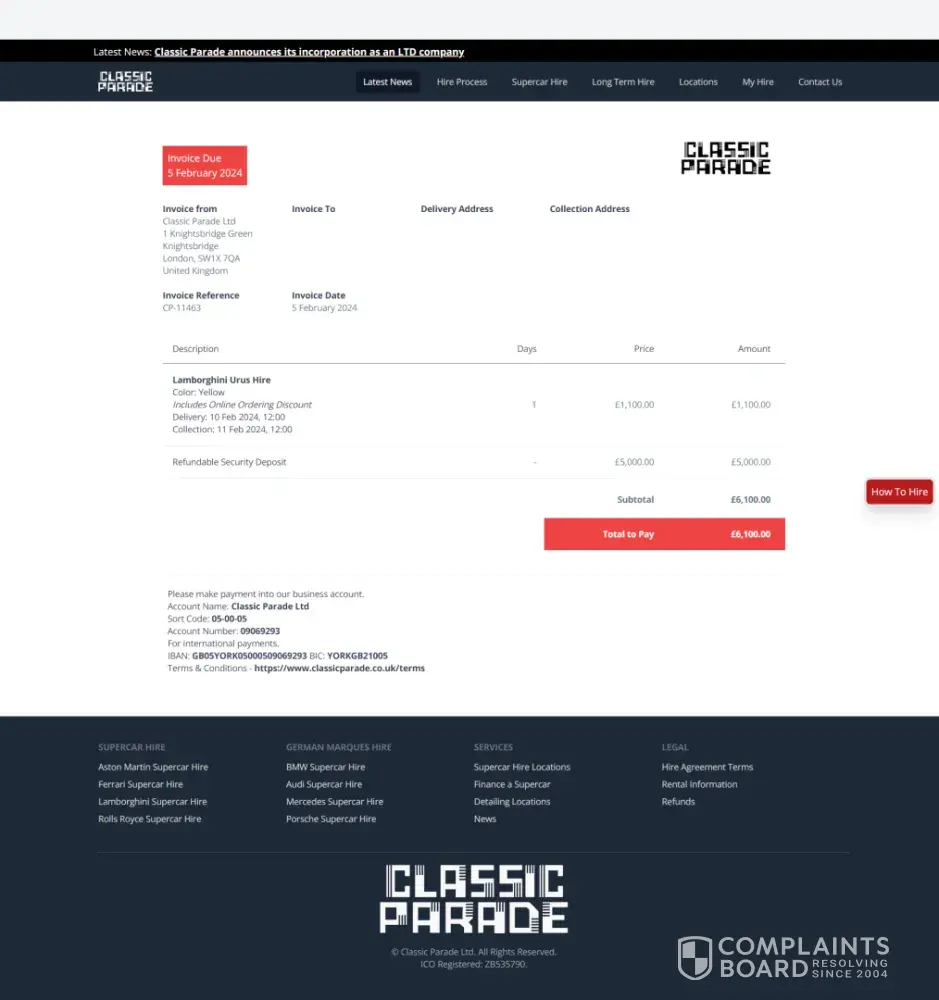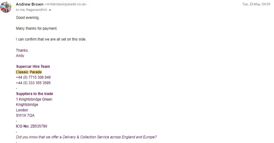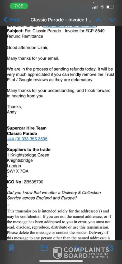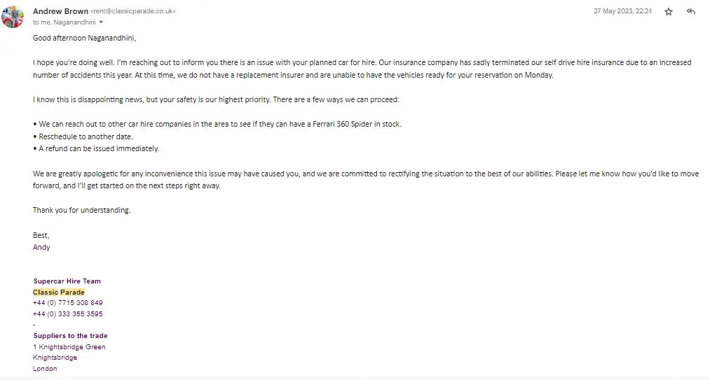 Had hired a Nissan GTR for a Saturday starting at 12:00am. Waited till 03:00 and after about 10 calls with the number +[protected] (which is absolutely useless) where they said we'll call you back (never did) or we'll escalate it I gave up and went to bed. I woke up to no messages or calls at all. The one email the company has, [protected]@classicparade.co.uk, which belongs to an Andrew Brown seems to be the only way of contacting or communicating with this company as the customer service team on that number don't seem to have a clue on anything that is going on - all they asked for was my name but didn't seem to have any tracking or useful information on car delivery. Anyway, Mr 'Brown' finally responds at around 12pm the next day and says sorry but the engine management light came on last night - which is odd as I've seen a few reviews that have said the same thing happened to them but there's no pictures or evidence and they were happy to keep me waiting for 3 hours. Make of that what you will but I didn't care at that point and just wanted a refund which is what Andrew said would be done first thing Monday morning and he would compensate me by offering me a free day of car hire in the future - how exciting! Shocker but it wasn't done on Monday morning and it's now Thursday at the time of this complaint. I held off on writing this complaint but enough is enough I want my £2450 back - Andrew was very responsive when it came to paying the invoice and booking the car but now it's time to pay me back he's suddenly quiet. There's a lot of red flags about this company and it is not well run with a great lack of professionalism that I wish I'd seen before using this company (e.g. company address of 1 Knightsbridge Grn, London SW1X 7QA but not registered on companies house, one email with no indication of any teams, 100s of bot reviews with only one review, negative reviews all reporting similar things, no internet footprint of this Andrew Brown character etc.)