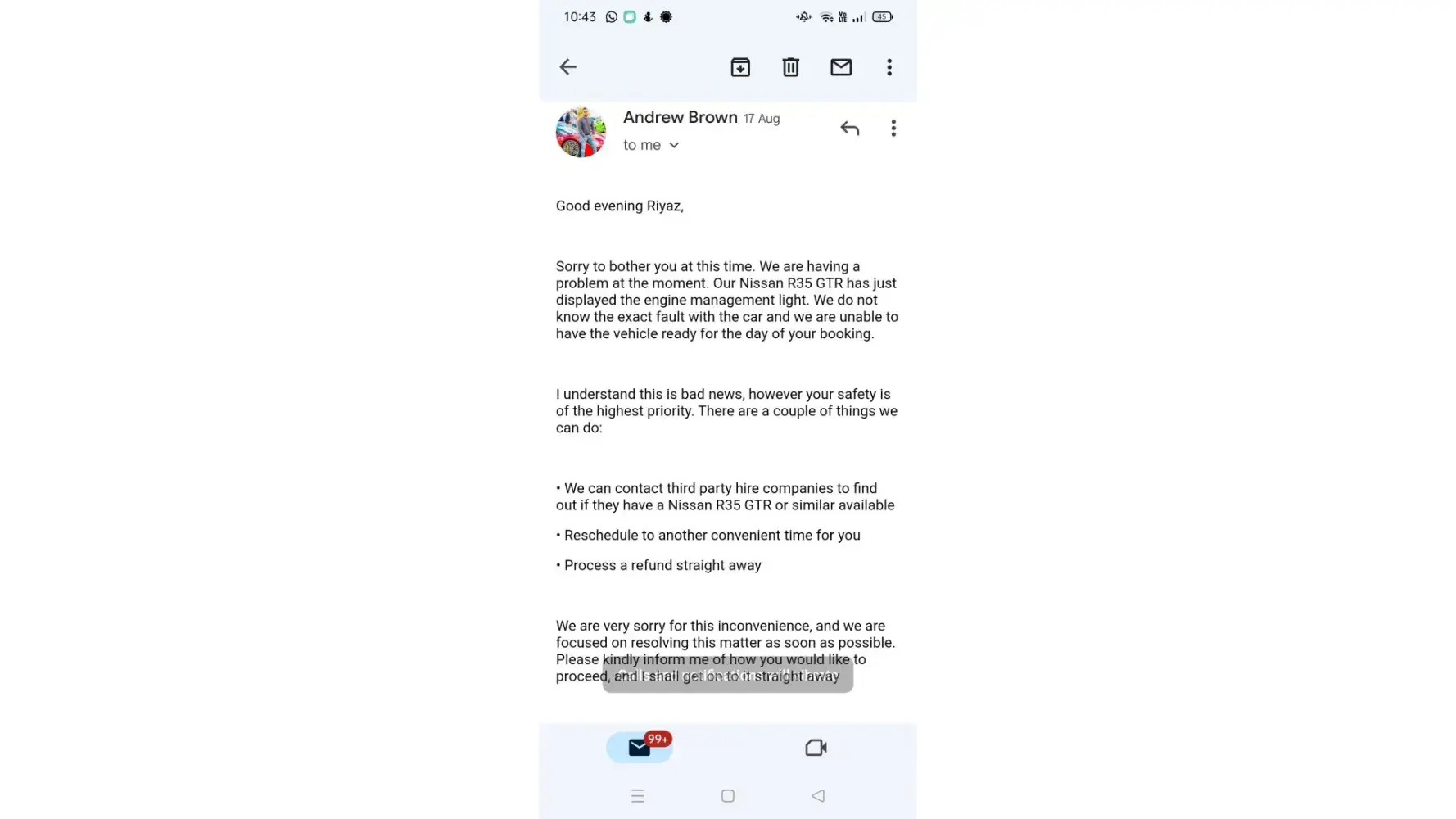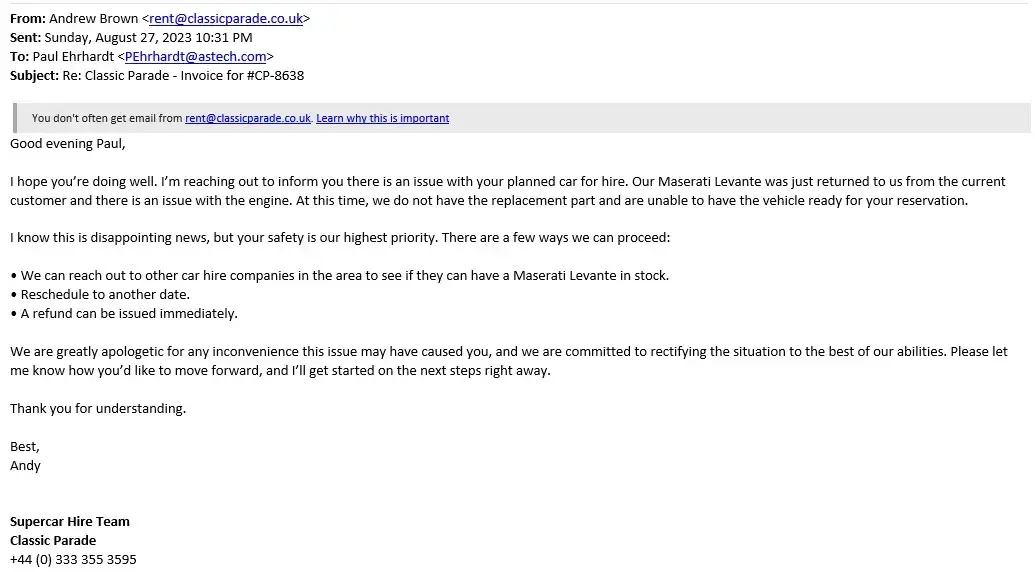 "I’m reaching out to inform you there is an issue with your planned car for hire. Our Maserati Levante was just returned to us from the current customer and there is an issue with the engine. At this time, we do not have the replacement part and are unable to have the vehicle ready for your reservation.
