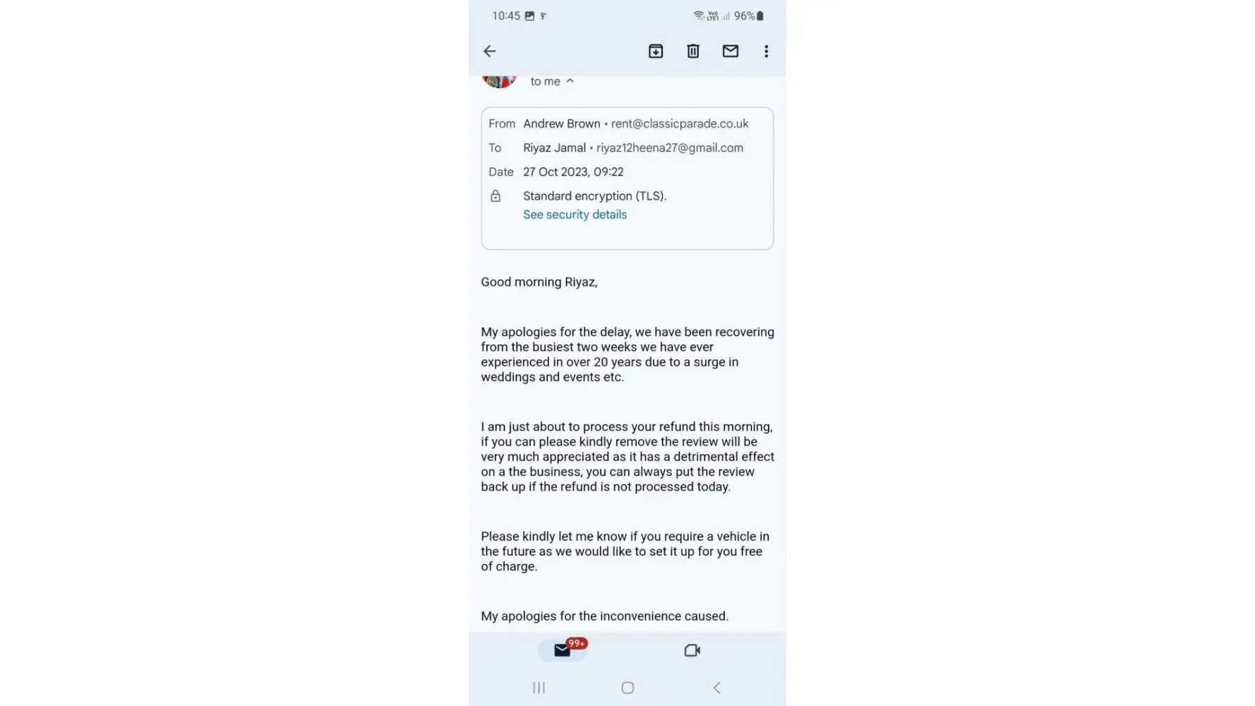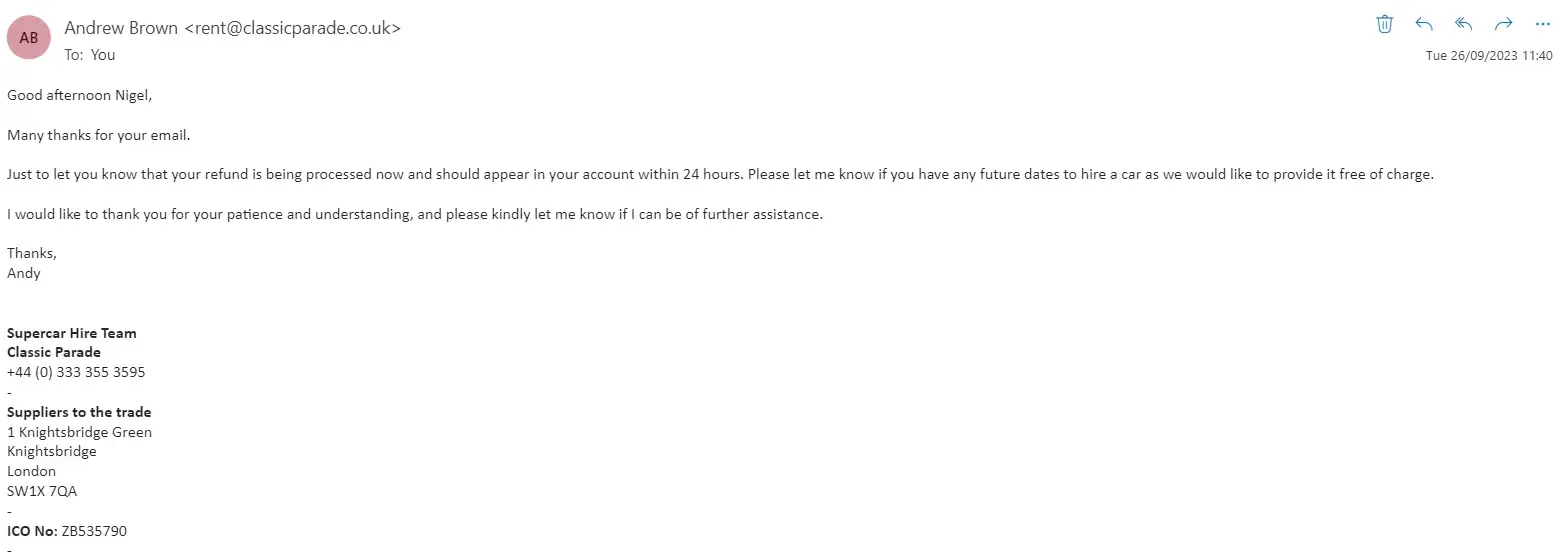 I hired a Lamborghini Huracan Spyder for the 20th August 2023. I gave a £5000 deposit and it was £1100 for the day to hire the supercar. A day or two before the hire day I received an email from Mr Andrew Brown about the Lamborghini having the engine light on and they would be unable to provide the car for the day I needed. There was an attempt to find a third party solution so the car could still be delivered for the day I needed. Unfortunately Classic Parade could not deliver the car even in this way. I was not too gutted about the car not turning up. After all it would just be a case of refunding my money so I can move on. Mr Brown said he could promptly give a refund. It is now the 9th of October 2023 and he has replied by email many times that he has refunded the money. However I have not received anything yet on numerous occasions.