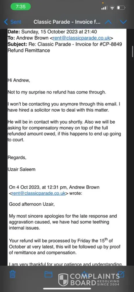 This matter has not been resolved as stated by the complaints department (Classic parade ltd). The refund (CP 8412)(£3350)is still outstanding since the 8th of September. We received another email from Andrew brown saying that the money will be refunded on the 15th of October and we still haven't received anything from them. We would really appreciate if this matter would be resolved by simply processing the refund. Riyaz.