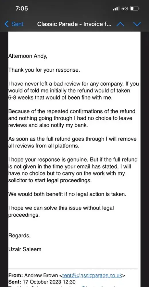The above review and previous reviews are not fake or malicious in any form. As a verified customer, they are true reviews towards classic parade Ltd with regards to refund for services not provided as per invoice CP-8412. I had a further email today [protected]) from Andrew Brown(Andy) and the contents remain the same since august and the refund is yet to be processed and/or resolved. I am being pressured continuously via his emails to remove the reviews which indicate the company's refund policy leaves a lot to be desired.
