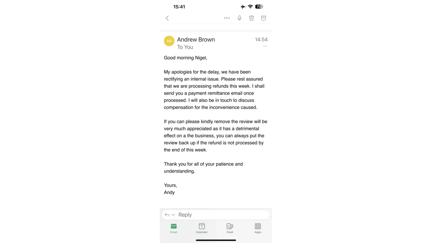 I received a response apologising for the inconvenience, and asking for my bank details for the refund - ignoring the details I had already sent. I’ve now sent over 5 chasing emails with my details reattached, but I’ve received no response from Andrew or anyone on the team. I’m unable to receive any response via email or phone.