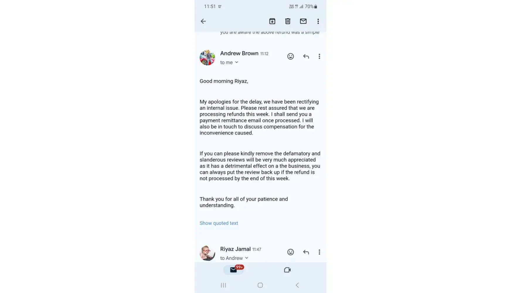 Attached recent email from Andrew Brown(Andy) where contents of the email are relating to nothing but issues since August. Kindly have the integrity and process/resolve the refund without any further delay.