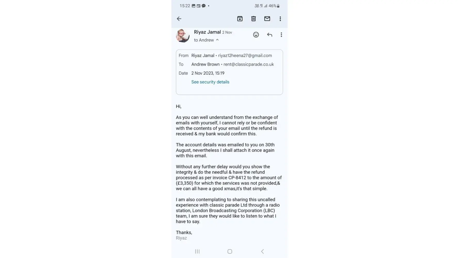Further to your reply on trust pilot for the above refund, this transfer of payment was made to Classic Parade Ltd on the 8th of August 2023 and you should not have a problem finding my name on your system. Failing to find my name on your system has started to occur when we opted for a refund. Further more, its the same case with Andrew Brown(Andy) and his emails mentioning nothing but issues when it comes to a refund. This is an appalling way of conducting business by with holding clients monies which is rightfully theirs.