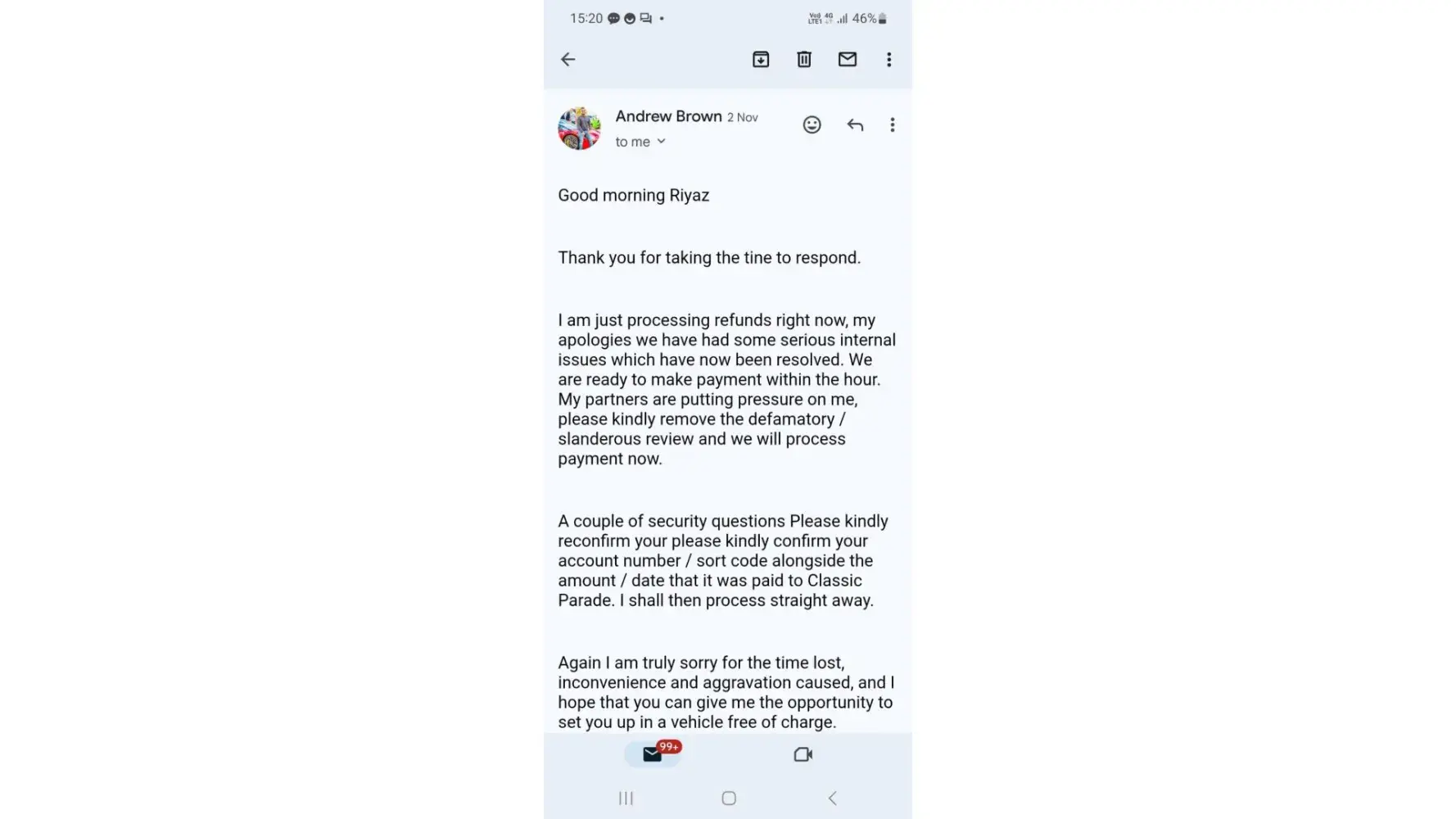 Therefore Andrew Brown apologied and mentioned he would refund the money on many occasions but has failed to do so and will make excuse upon excuse that he is busy.