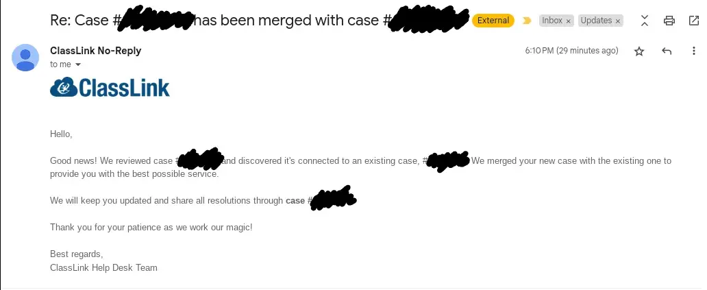 Also, on May 17, 2025, somewhere near 10 PM (PST), ClassLink merged my case to the case from April 2025 (not sure if this is true). But before 10 PM at that time, I requested it again a few hours before 9 PM with the mention of the complaint here. There was no response after merging it