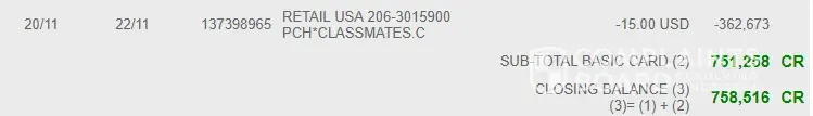 Transaction Process 0/11 -22/11 [protected] RETAIL USA [protected] PCH*CLASSMATES.C 15.00 USD